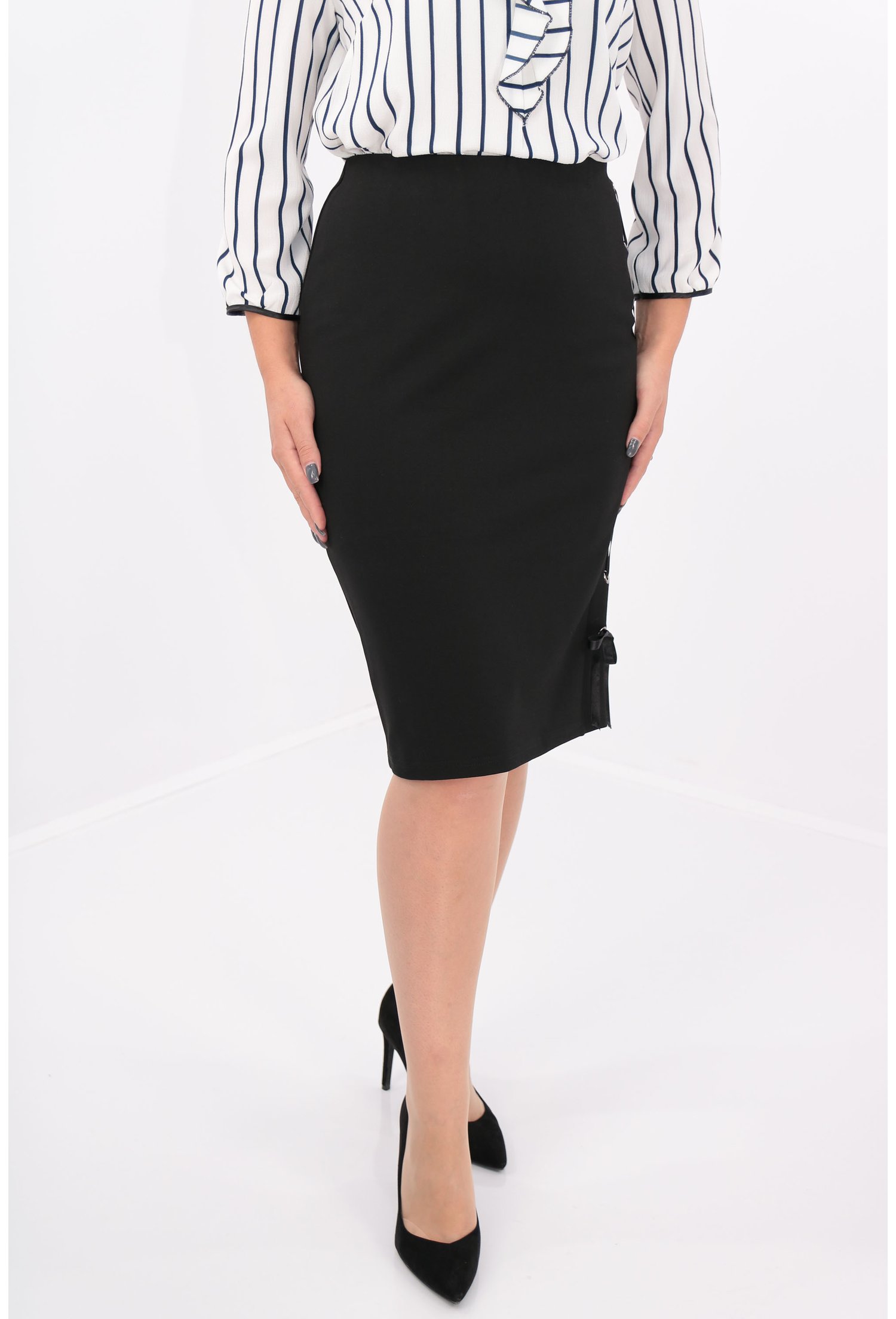 -Fusta conica neagra din jerse gros -Captusita -Elastic in talie -Siret decorativ cu capse argintii pe soldul stang -Fabricat in Romania MATERIAL: 95% Vascoza, 5% Elastan LUNGIME: 60 cm