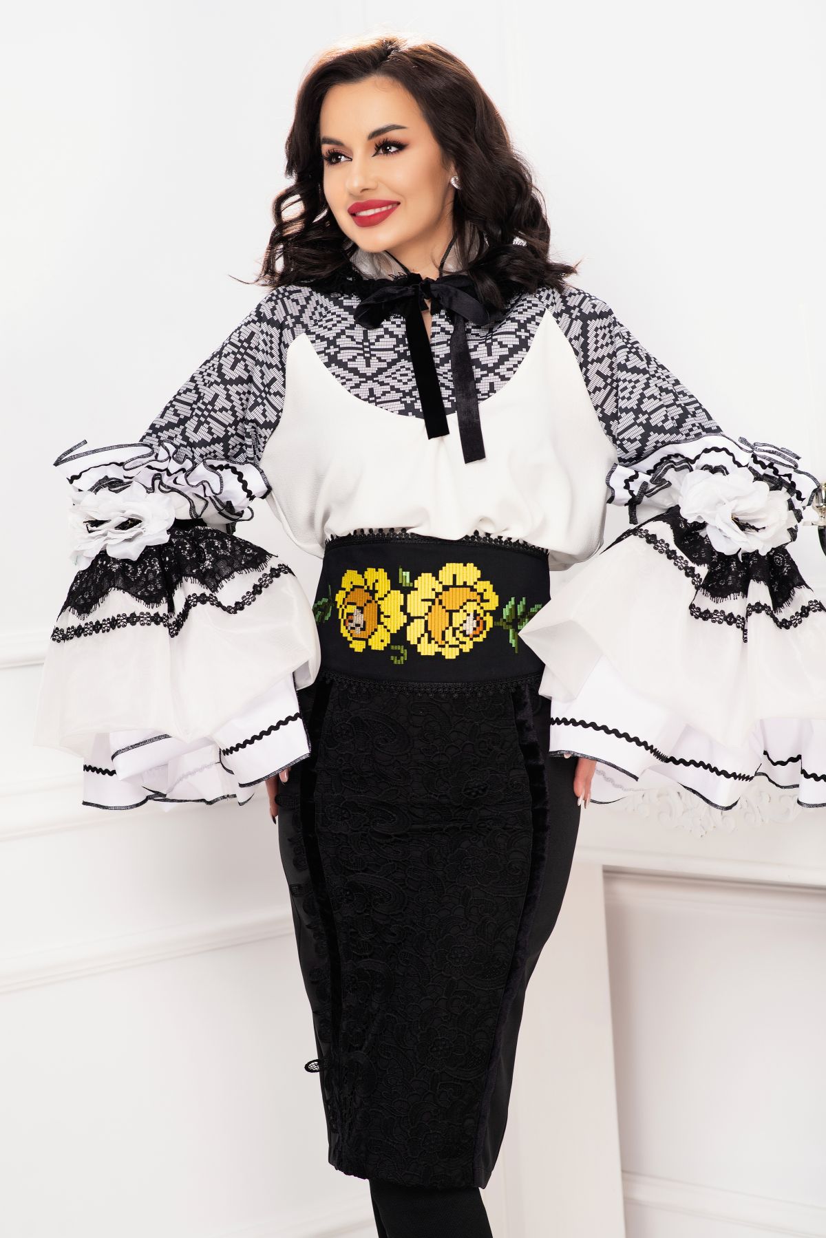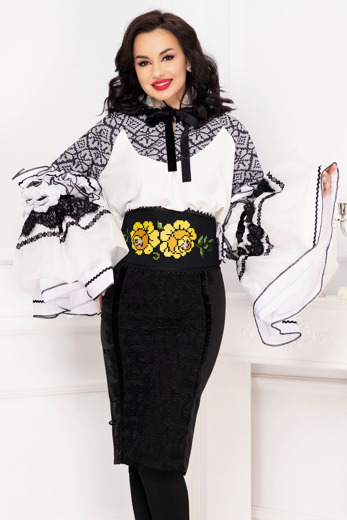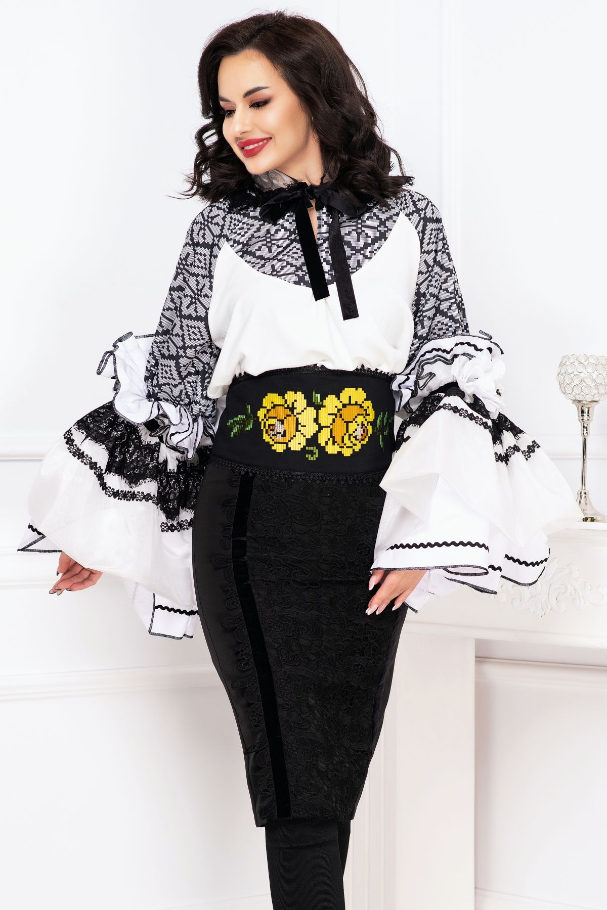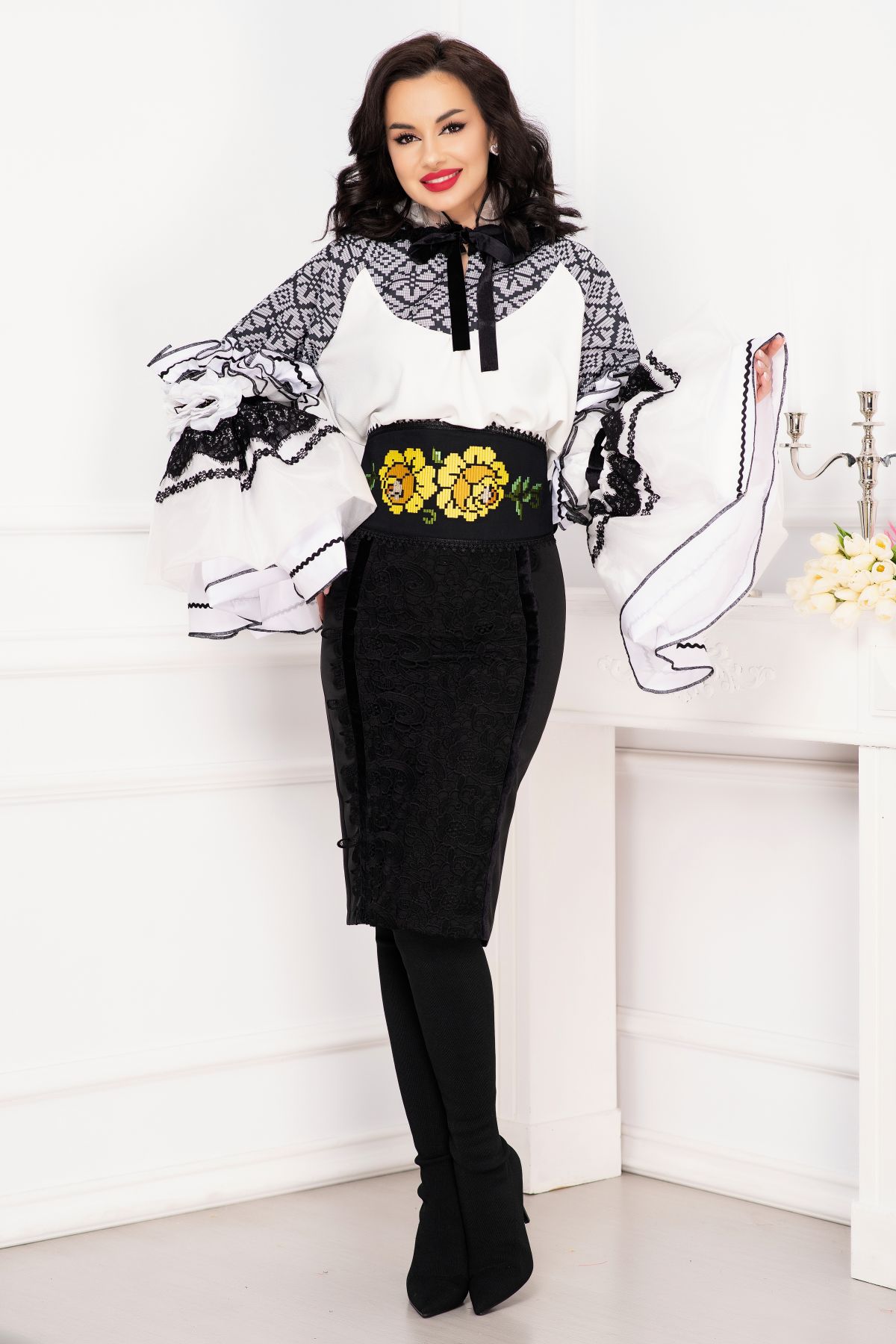 Fusta eleganta conica Venezia cu dantela lata si benzi din catifea ; Culoare: negru ; Talie inalta ; Croi conic ; Inchidere cu fermoar auriu la spate ; Crapatura la spate ; Banda lata din dantela neagra aplicata frontal ; Prezinta dublura neagra ; Benzi din catifea care delimiteaza dantela ; Compozitie: 80% poliester 17% vascoza 3% elastan ; Captusala: 100% poliester ; Fabricat in Romania ; * Echipa InPuff face toate eforturile in a prezenta cat mai bine culorile produselor prezentate pe site insa culorile pot diferi de situatia reala si pot varia în functie de setarile monitorului/dispozitivului dvs!