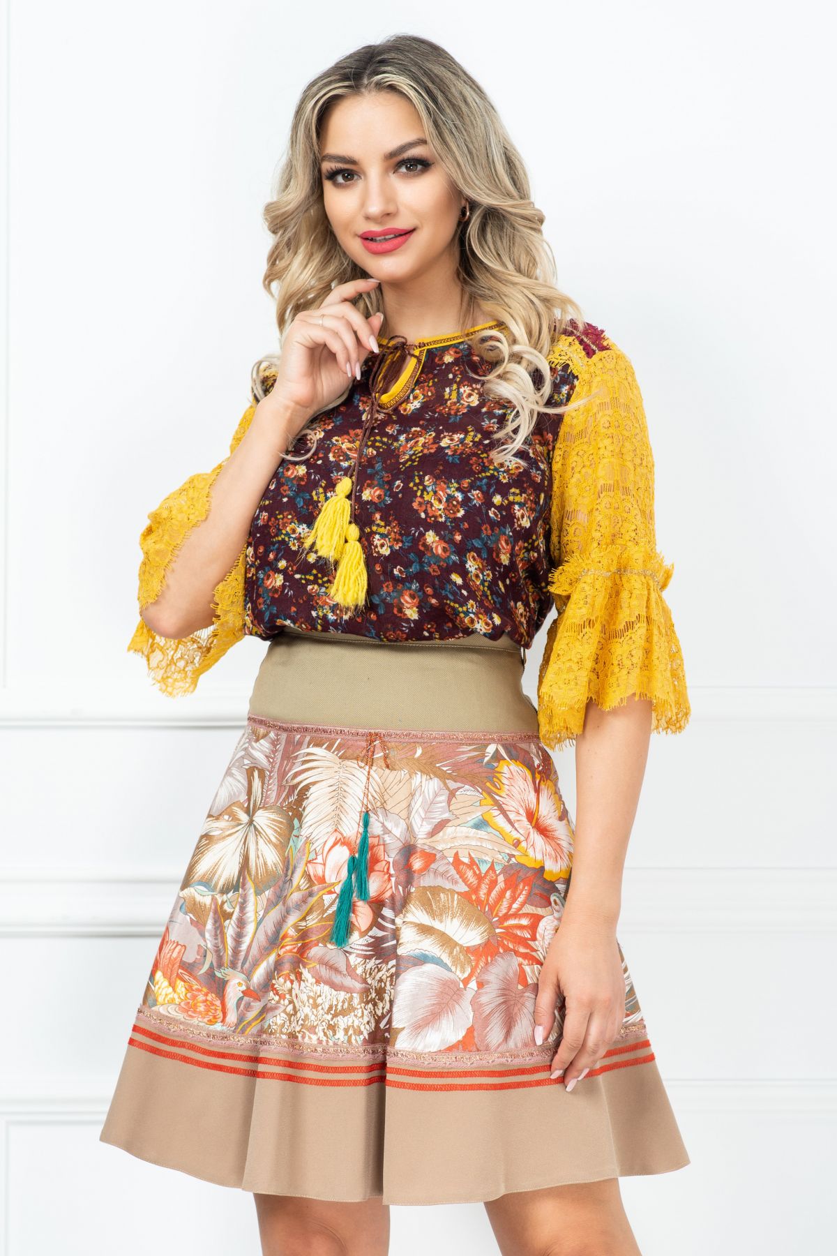 Fusta in clos grej cu imprimeu floral Culoare:grejCroi:closTalie inaltaInchidere cu fermoar la spatePrezinta dubluraInsertii cu fir irizantImprimeu floral deosebitCompozitie: 60% bumbac 40% poliesterFabricat in Romania* Modelul nostru poarta marimea 36(S)!* Echipa InPuff face toate eforturile in a prezenta cat mai bine culorile produselor prezentate pe site insa culorile pot diferi de situatia reala si pot varia în functie de setarile monitorului/dispozitivului dvs