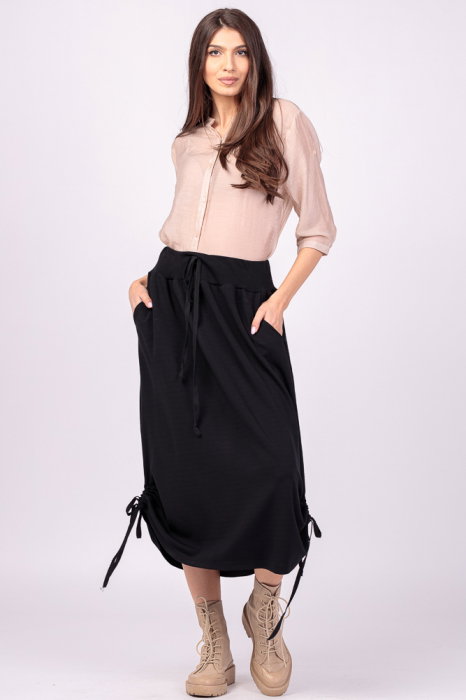 Fusta are buzunare laterale Are la baza, in laterale doua sireturi ce se pot strange pentru o aparitie trandy Are banda lata in talie, cu siret reglator Material: 40%vascoza, 60% poliester Descrierea dimensiunilor: S M: talie cm, lungime…