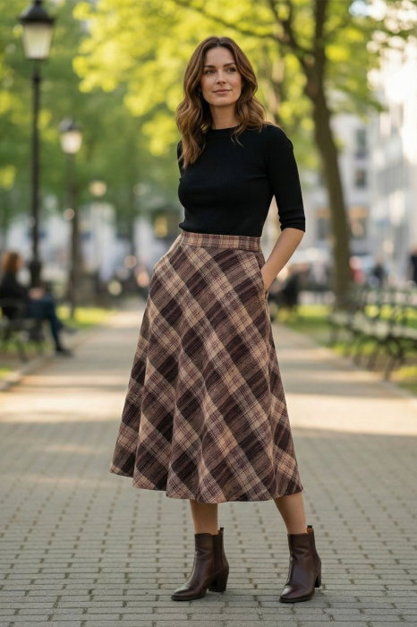 Fusta midi evazata in carouri maro cu bej, cu talie inalta si buzunare laterale