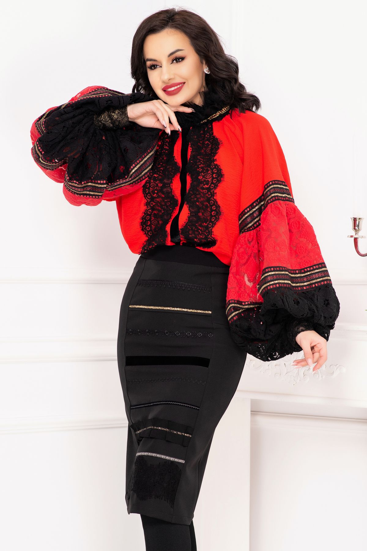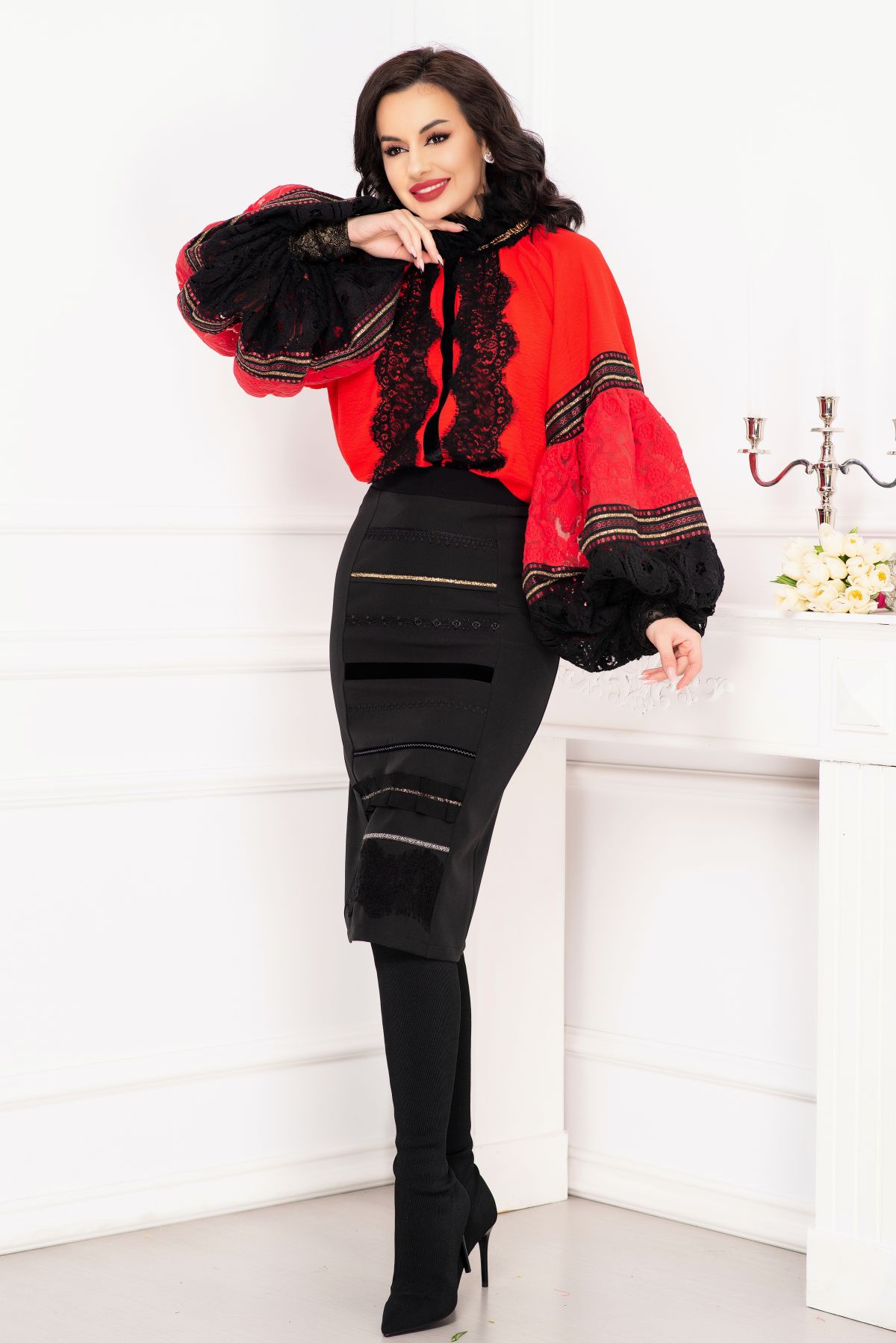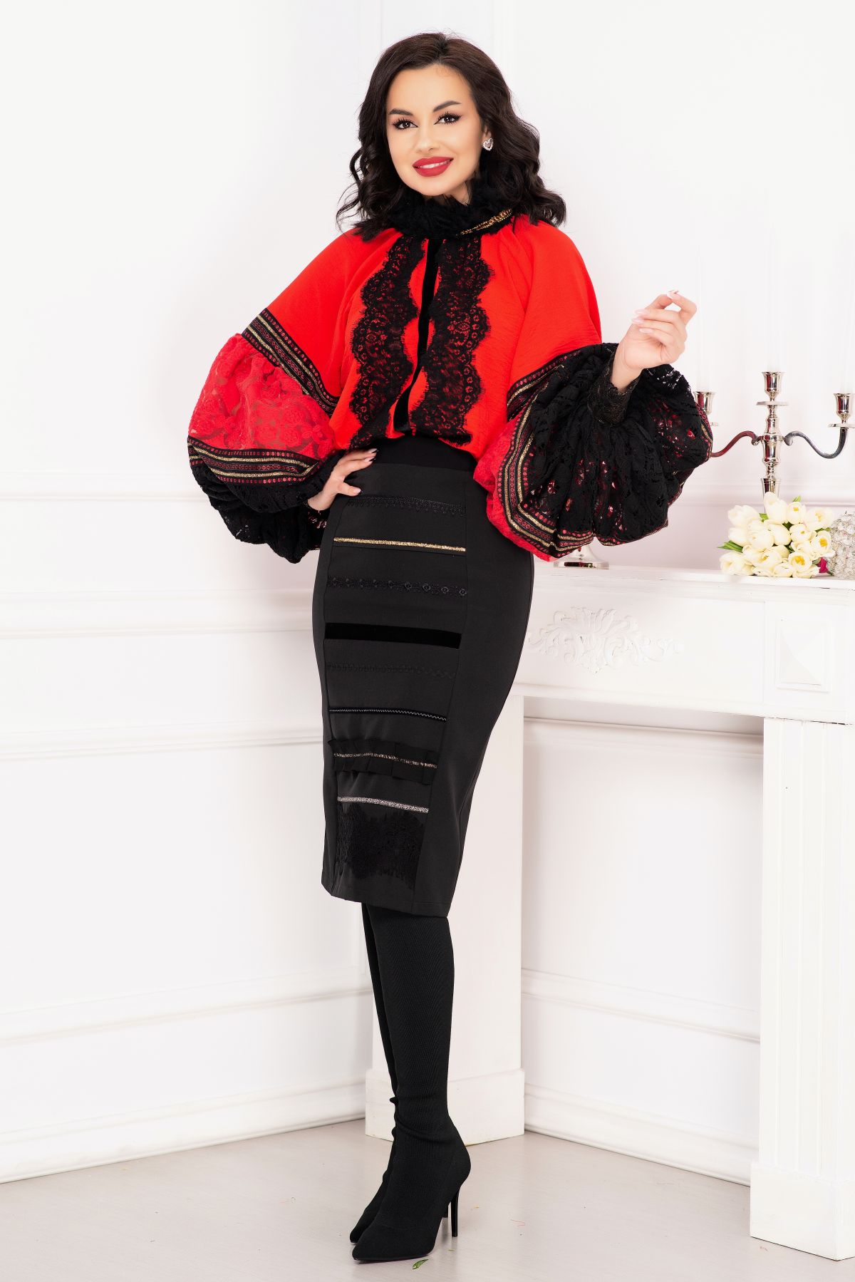 Fusta traditionala Venezia neagra cu fota ; Culoare: negru ; Talie inalta ; Croi conic ; Inchidere cu fermoar auriu la spate ; Crapatura la spate ; Fota in partea din fata ; Prezinta dublura neagra ; Dantela neagra la terminatie ; Benzi decorative traditionale aplicate pe fota ; Compozitie: 80% poliester 17% vascoza 3% elastan ; Captusala: 100% poliester ; Fabricat in Romania ; * Echipa InPuff face toate eforturile in a prezenta cat mai bine culorile produselor prezentate pe site insa culorile pot diferi de situatia reala si pot varia în functie de setarile monitorului/dispozitivului dvs!