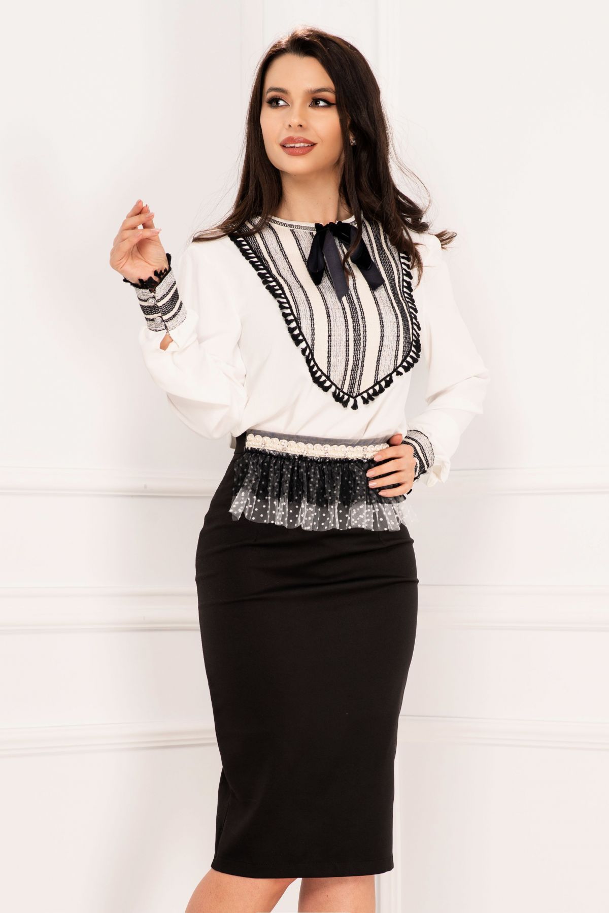 Fusta Venezia eleganta cu aplicatie din tulle si perle ; Culoare:negru ; Talie inalta ; Croi conic ; Inchidere cu fermoar auriu la spate ; Crapatura la spate ; Prezinta dublura ; Tulle cu buline alb si negru in partea de sus ; Banda eleganta din perle si strassuri ; Compozitie: 95% poliester 5% elastan ; Fabricat in Romania ; * Echipa InPuff face toate eforturile in a prezenta cat mai bine culorile produselor prezentate pe site insa culorile pot diferi de situatia reala si pot varia în functie de setarile monitorului/dispozitivului dvs!