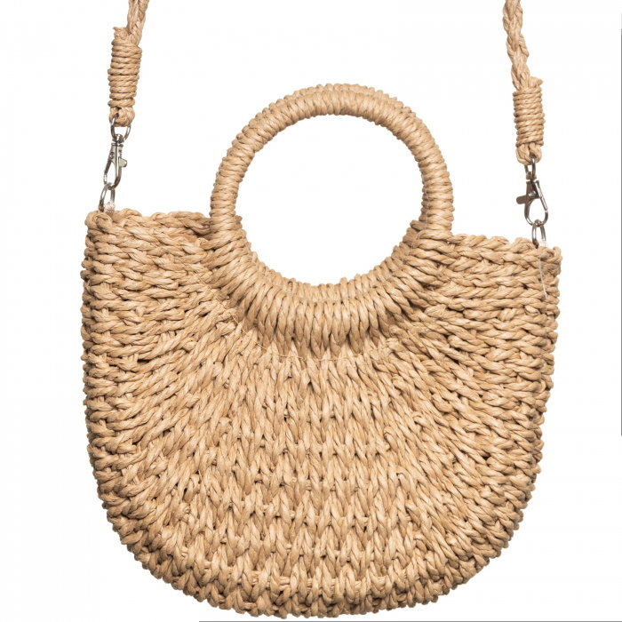 Inchidere cu snur si captusita la interior cu material textil cu aceeasi nuanta. Bareta de umar impletita 124 cm ce se poate scoate, manere circulare cu diametru de 12 cm, buzunar interior fara fermoar Material : exterior – fibre de hartie, interior…