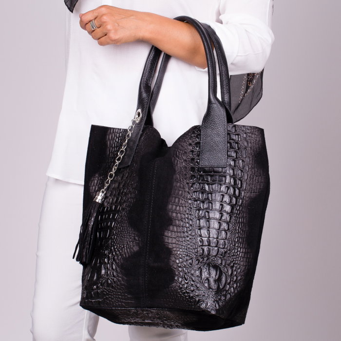 Comandă online o Geanta shopper neagra din piele intoarsa naturala cu livrare rapidă prin curier sau la easybox!