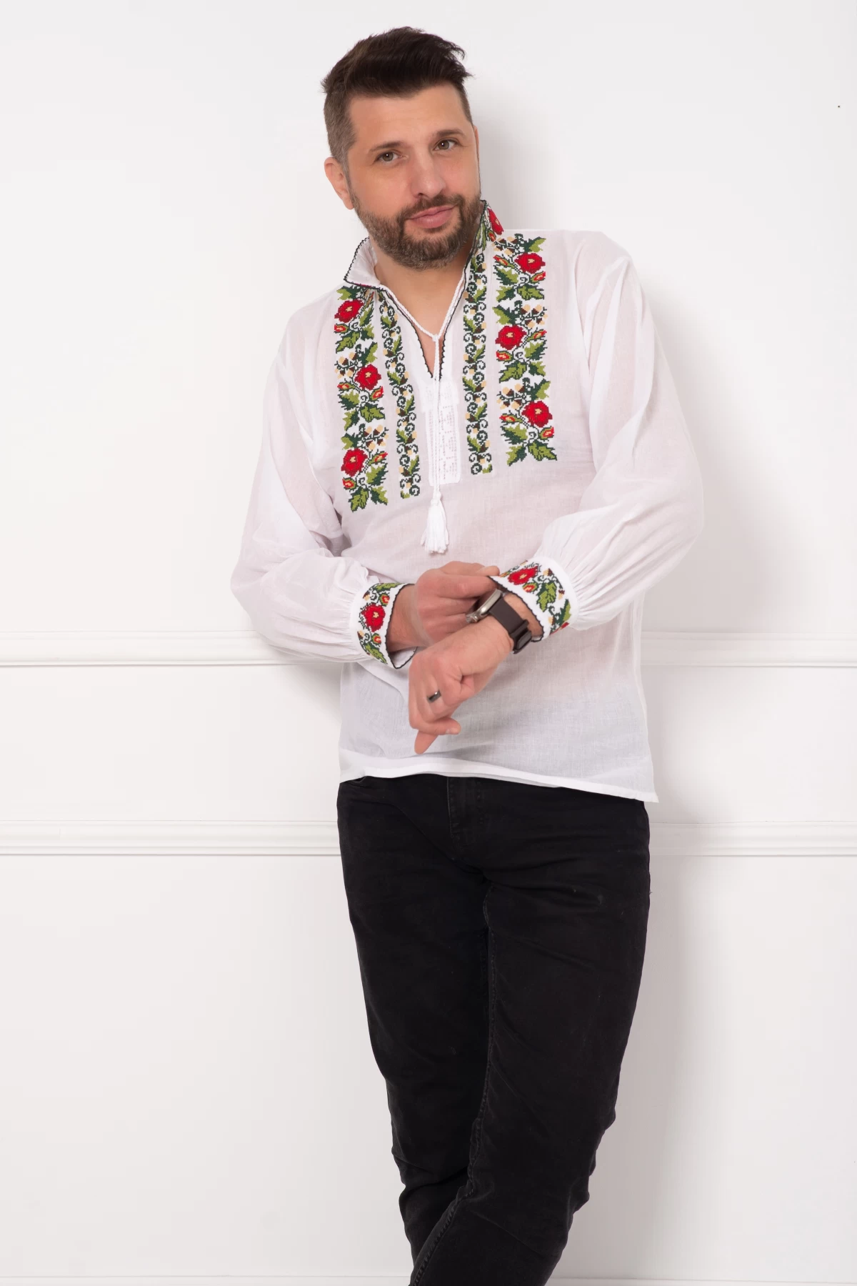 Ie barbateasca alba din bumbac brodata cu motivul trandafirului Culoare: albTextura: panzaCroi: dreptManeci lungiMansete late brodate cu un nastureGuler cazacesc brodatInchidere la baza gatului cu snur cu ciucuri albiBroderie cu simbolul traditional al trandafiruluiCompozitie: 100% bumbac* Echipa noastra face toate eforturile in a prezenta cat mai bine culorile produselor prezentate pe site insa culorile pot diferi de situatia reala si pot varia în functie de setarile monitorului/dispozitivului dvs!