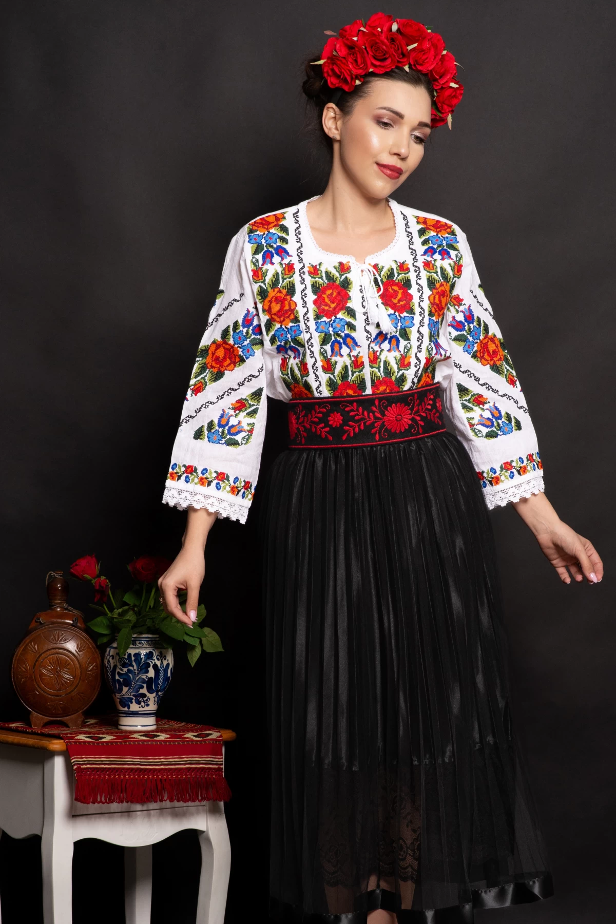 Ie dama alba din bumbac Madalina cu simbolul trandafirului