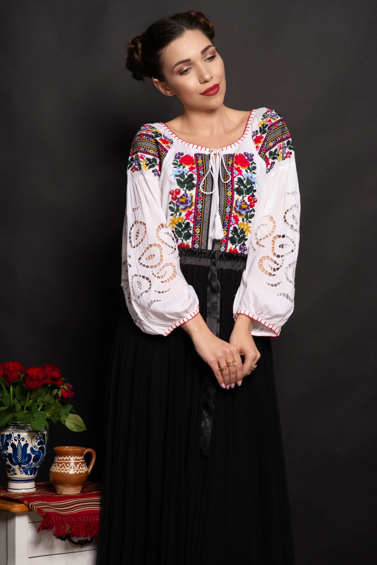 Ie dama alba Stefania cu broderie florala traditionala