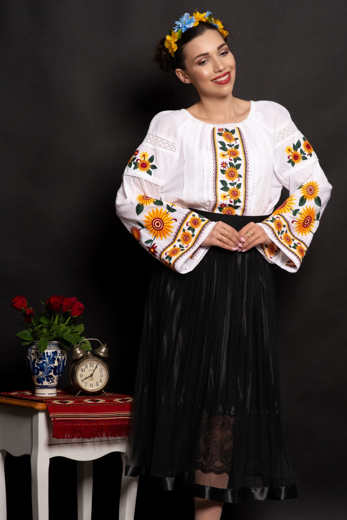 Ie dama brodata cu floarea soarelui si maneci evazate