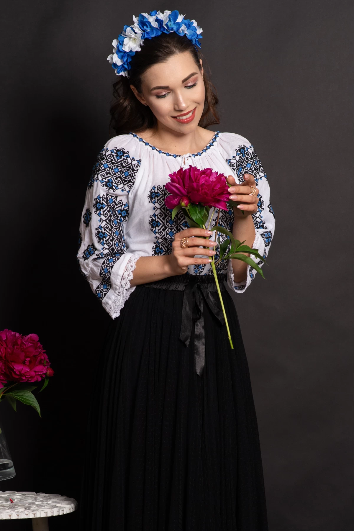 Ie dama din bumbac Niculina cu broderie bleu si simbolul rombului Compozitie: 100% bumbac