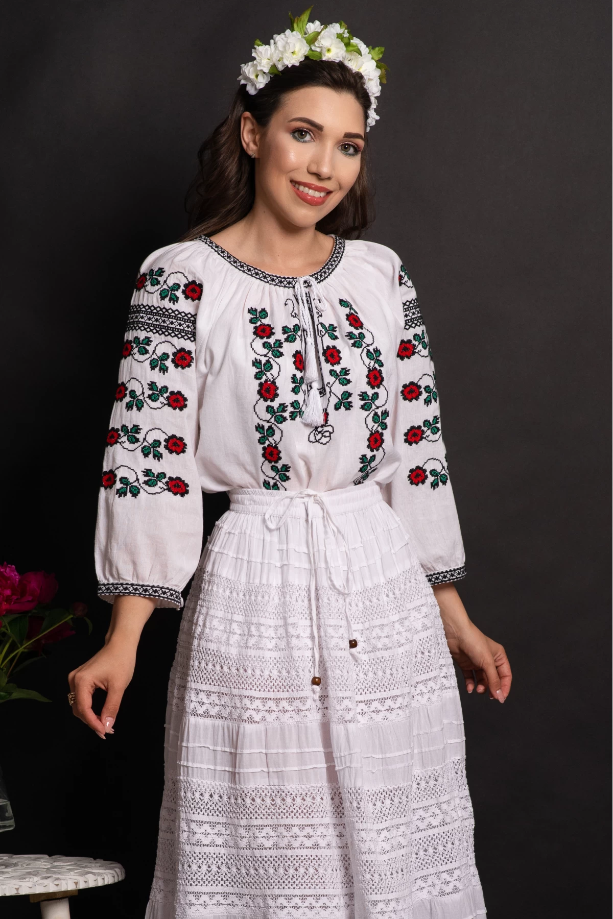 Comandă online o Ie dama traditionala din bumbac Clemente cu flori brodate cu livrare rapidă prin curier sau easybox!