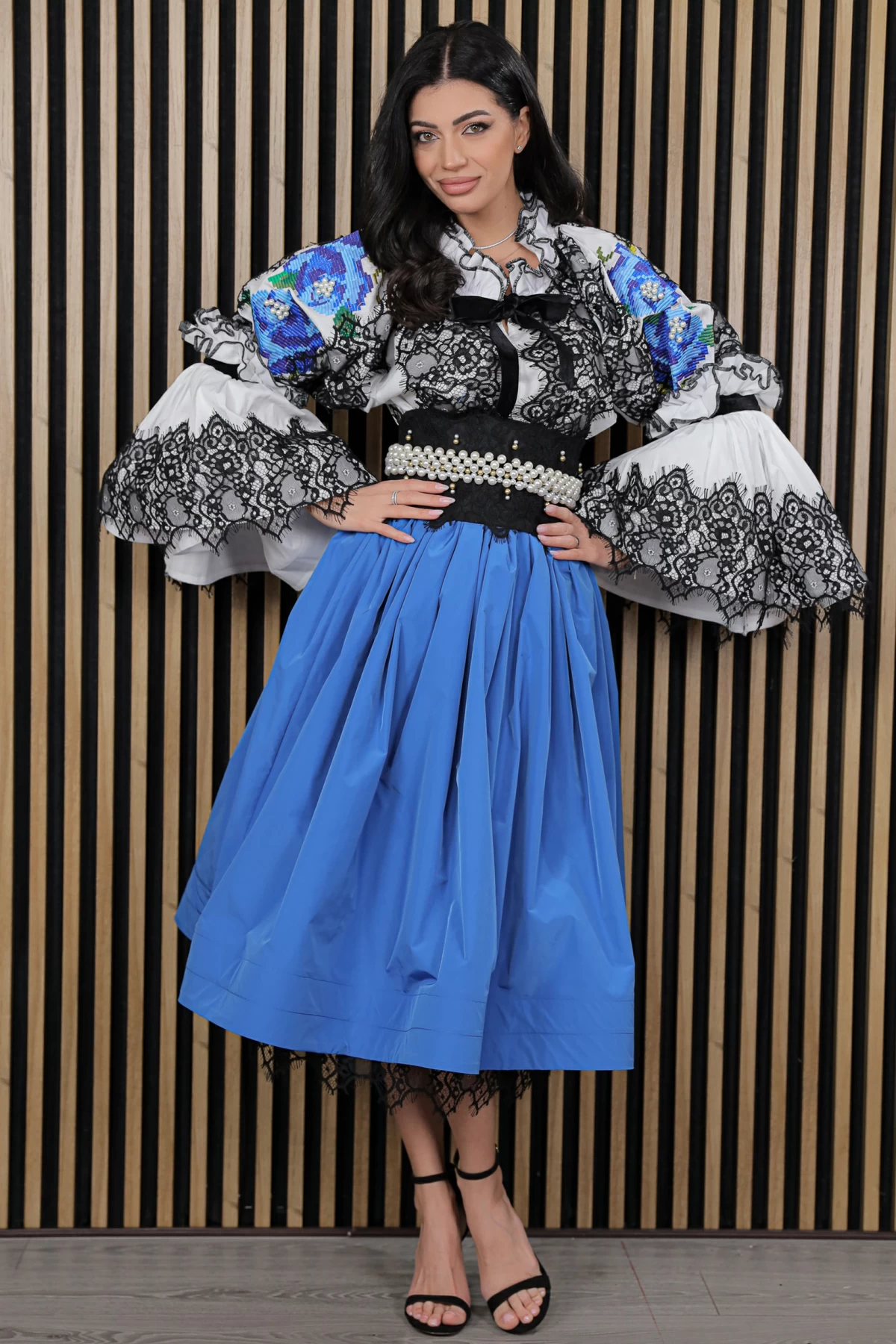 Ie traditionala Albastru de Vis cu volane ample si dantela pretioasa Cu fiecare cusatura Ie Albastru de Vis spune o poveste despre gratie feminitate si noblete. Realizata din bumbac fin cu insertii de dantela neagra si broderie florala cu motivul trandafirului intens colorata în nuante de albastru celest aceasta ie stilizata se remarca prin rafinament si armonie vizuala. Mânecile ample cu volane dramatice si detalii perlate adauga un aer teatral regal iar panglica neagra ce încununeaza decolteul este detaliul discret care desavârseste compozitia. Este o piesa creata pentru femeia care îsi cunoaste radacinile si le transforma în stil personal puternic poetic si memorabil.Compozitie: 95% poliester 5% elastanFabricat in Romania* Echipa noastra face toate eforturile in a prezenta cat mai bine culorile produselor prezentate pe site insa culorile pot diferi de situatia reala si pot varia în functie de setarile monitorului/dispozitivului dvs!