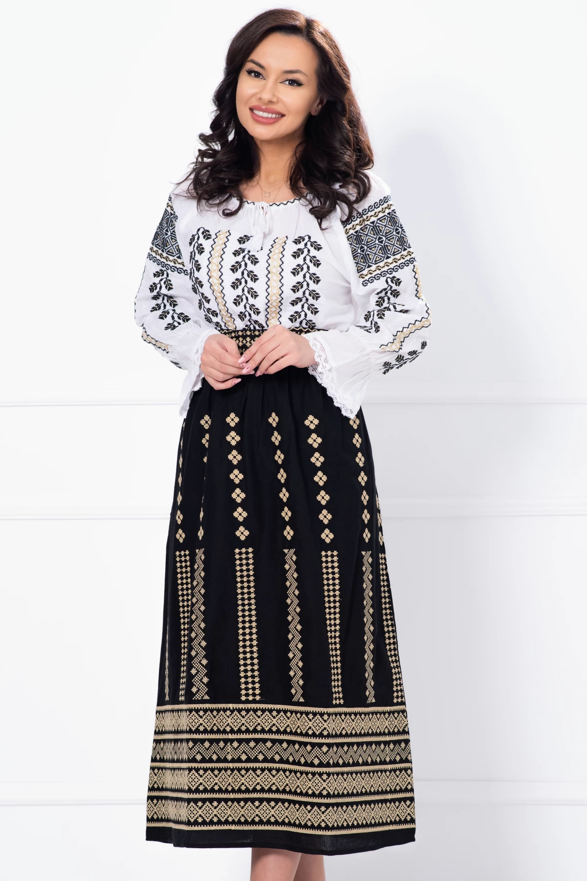 Ie traditionala Iasmina brodata cu simbolul frunzei si fir aurit Culoare: alb negruauriuCroi: lejerManeci lungi Mansete elasticeDecolteu rotundVolan tip clopot la terminatia maneciiInchidere cu snur cu ciucuri la baza gatuluiBroderie pretioasa cu simbolul frunzei si fir auritCompozitie: 100% bumbac* Echipa noastra face toate eforturile in a prezenta cat mai bine culorile produselor prezentate pe site insa culorile pot diferi de situatia reala si pot varia în functie de setarile monitorului/dispozitivului dvs!