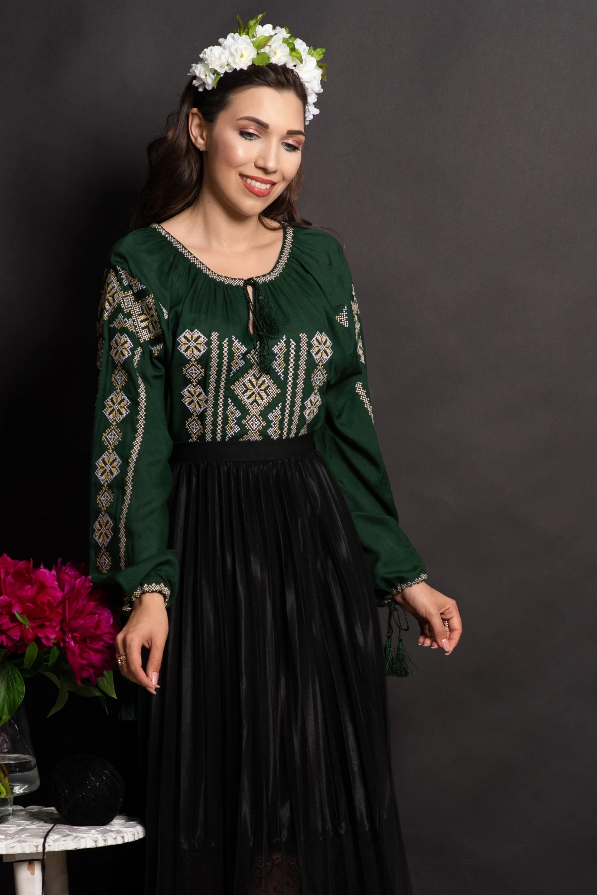 Ie traditionala verde Lenora cu romburi aurii brodate Compozitie: 100% vascoza