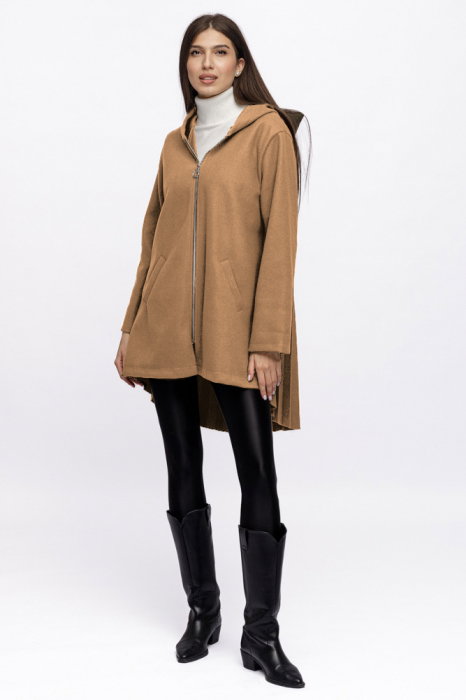 Comandă online o Jacheta midi cu gluga si pliseu pe spate, din stofa camel cu livrare rapidă prin curier sau la easybox!
