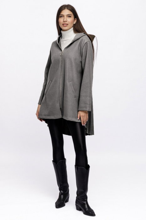 Comandă online o Jacheta midi cu gluga si pliseu pe spate, din stofa gri cu livrare rapidă prin curier sau la easybox!