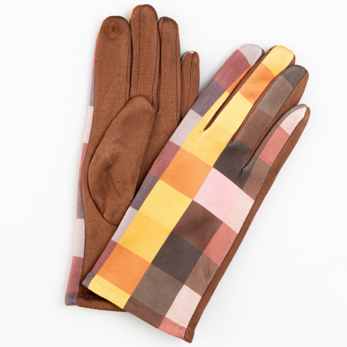 Comandă online o Manusi dama imprimeu patrate galbene si maro pe fond camel, material catifelat cu livrare rapidă prin curier sau la easybox!