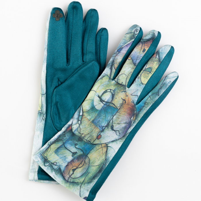 Comandă online o Manusi dama imprimeu pictural abstract pe fond turcoaz, material catifelat cu livrare rapidă prin curier sau la easybox!