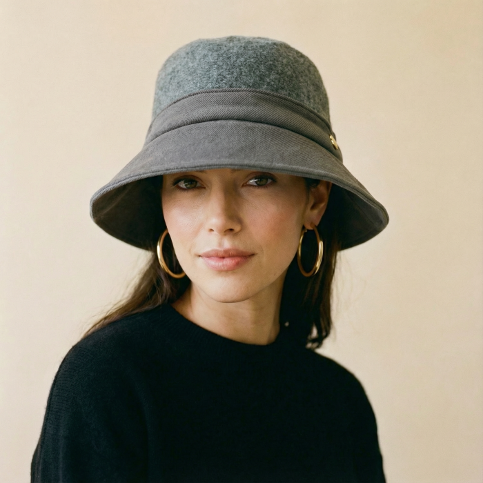 Palarie flexibila de lana si stofa cu bor mic si funda la spate, gri