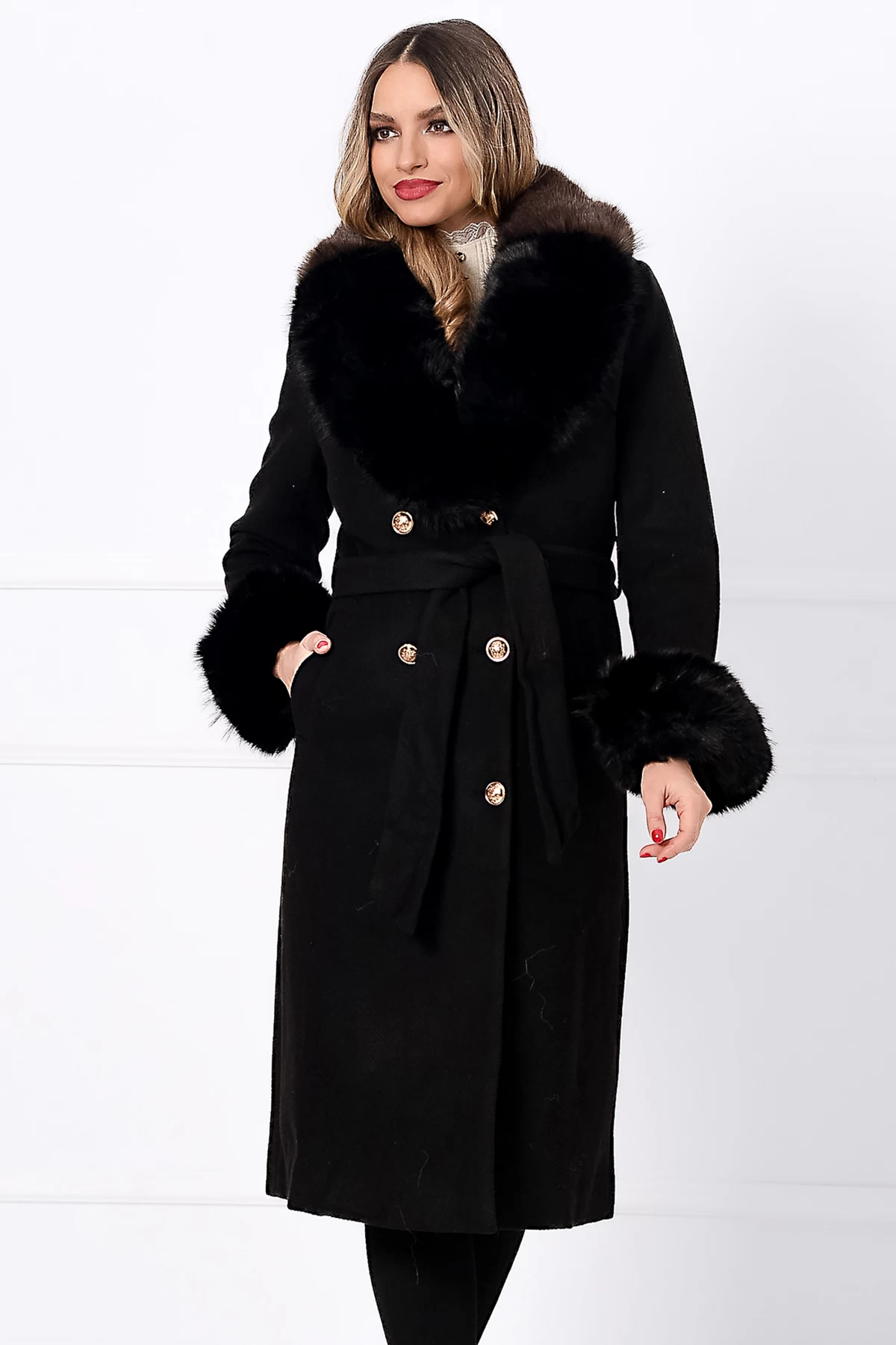 Palton dama lung elegant negru Aleksandra matlasat din stofa cu blana eco Culoare: negru maronTextura: stofaMatlasata pe interiorTesatura texturataMansete decorate cu blana ecologica Doua randuri de nasturi auriiBuzunare laterale functionaleGuler elegant bicolor din blana ecologicaInchidere frontala cu nasturiCordon detasabil in talieCompozitie: 60% poliester 40% lana* Echipa noastra face toate eforturile in a prezenta cat mai bine culorile produselor prezentate pe site insa culorile pot diferi de situatia reala si pot varia în functie de setarile monitorului/dispozitivului dvs!
