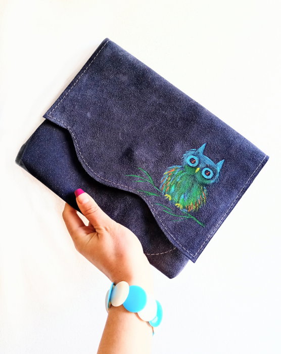 Plic handmade bleumarin din piele naturala intoarsa ,pictat manual