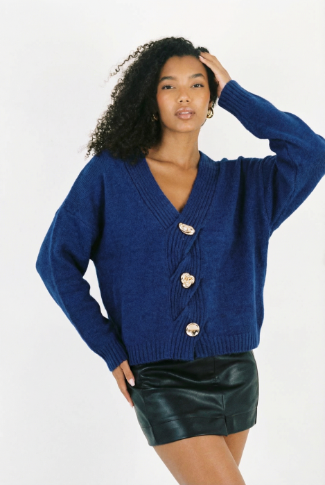 Comandă online o Pulover cu nasturi decorativi impletitura decorativa pe piept si decolteu in V, albastru electric cu livrare rapidă prin curier sau la easybox!