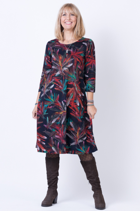 Comandă online o Rochie A line midi, imprimeu pene multicolore pe fond bleumarin cu livrare rapidă prin curier sau la easybox!