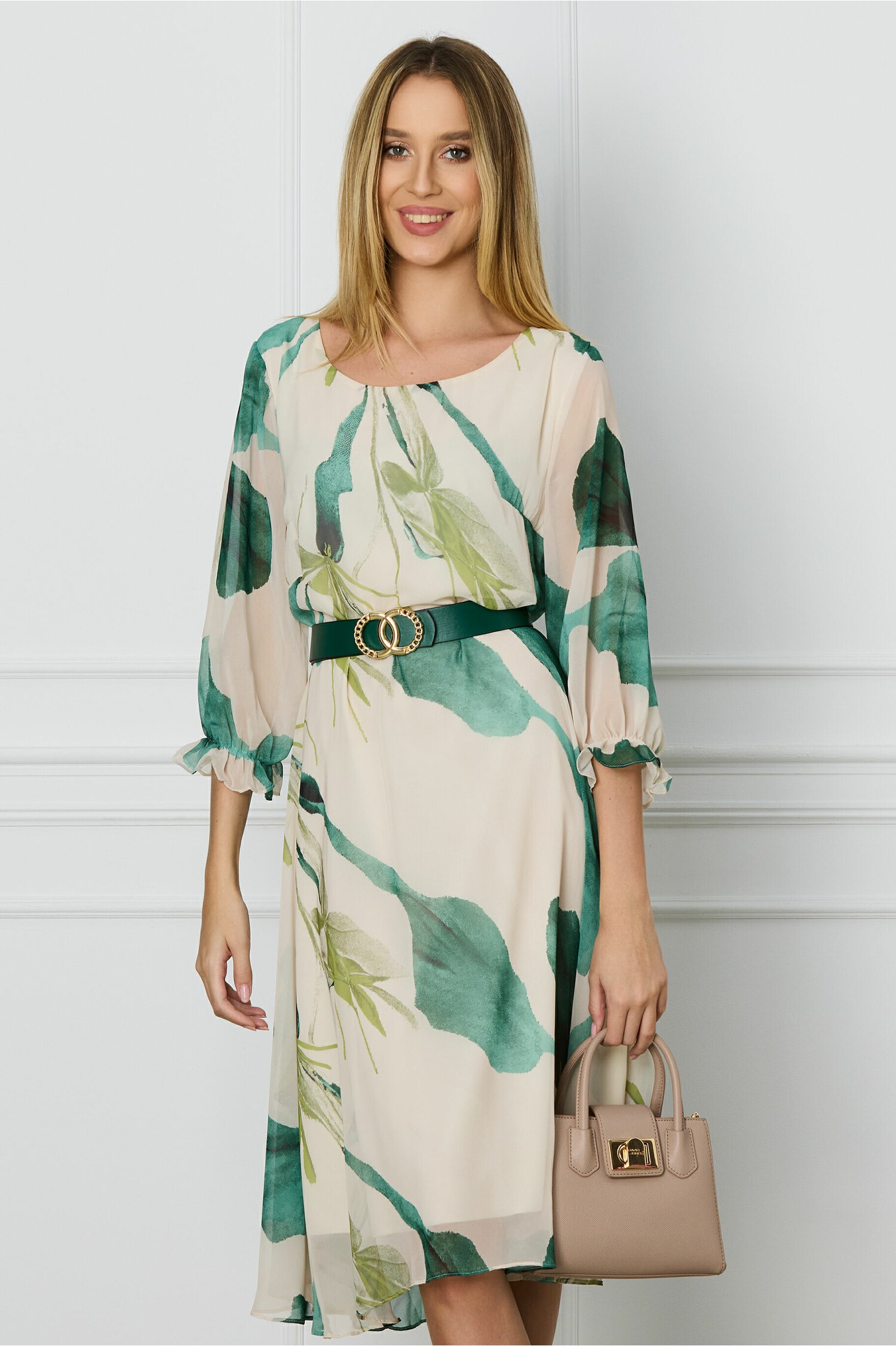 Comandă o Rochie Ana ivory din voal cu imprimeu verde si curea in talie cu LIVRARE și RETUR GRATUIT!