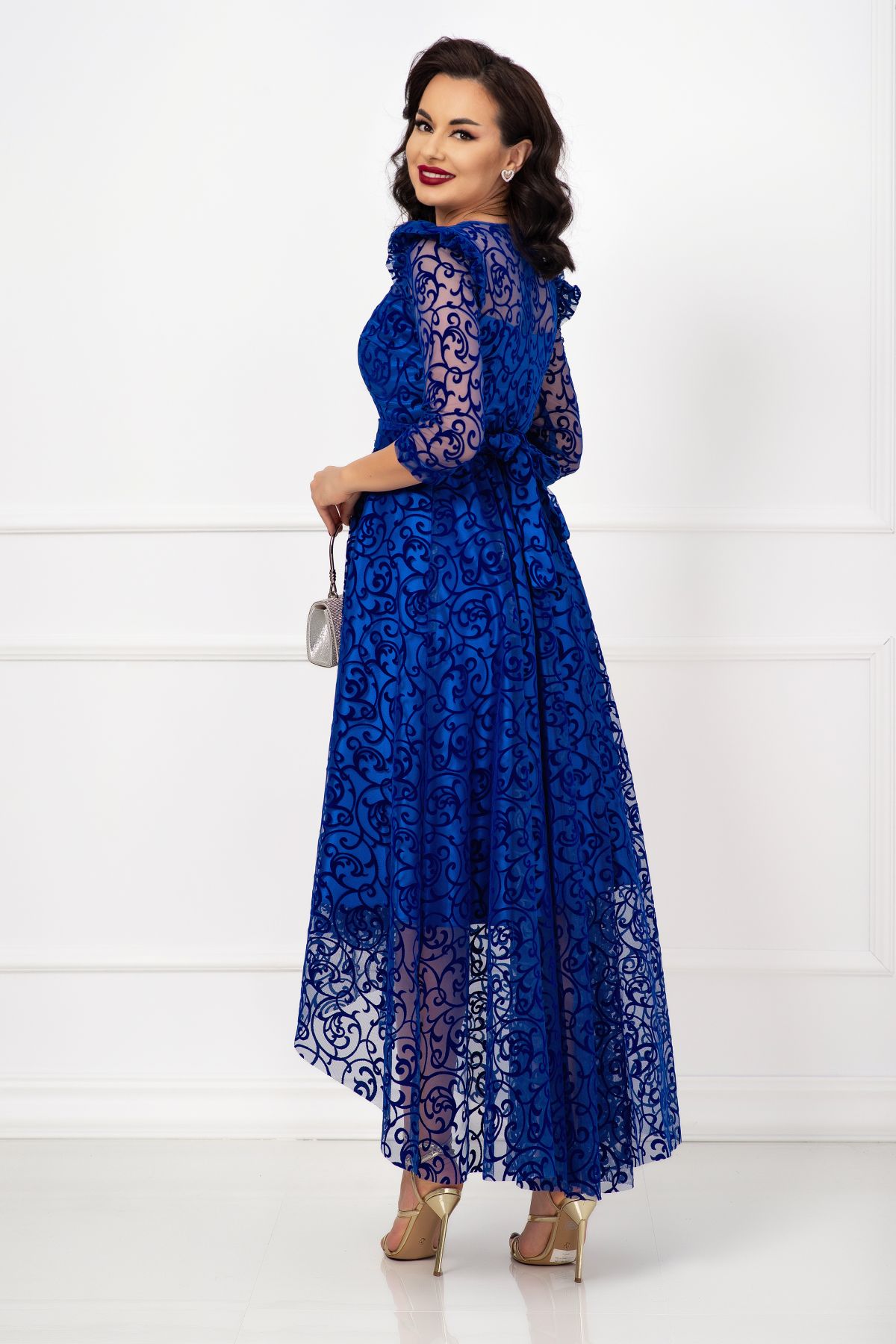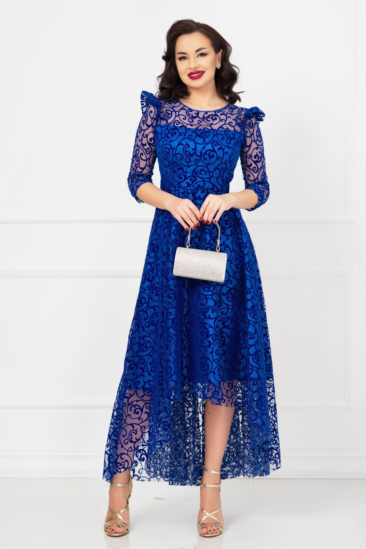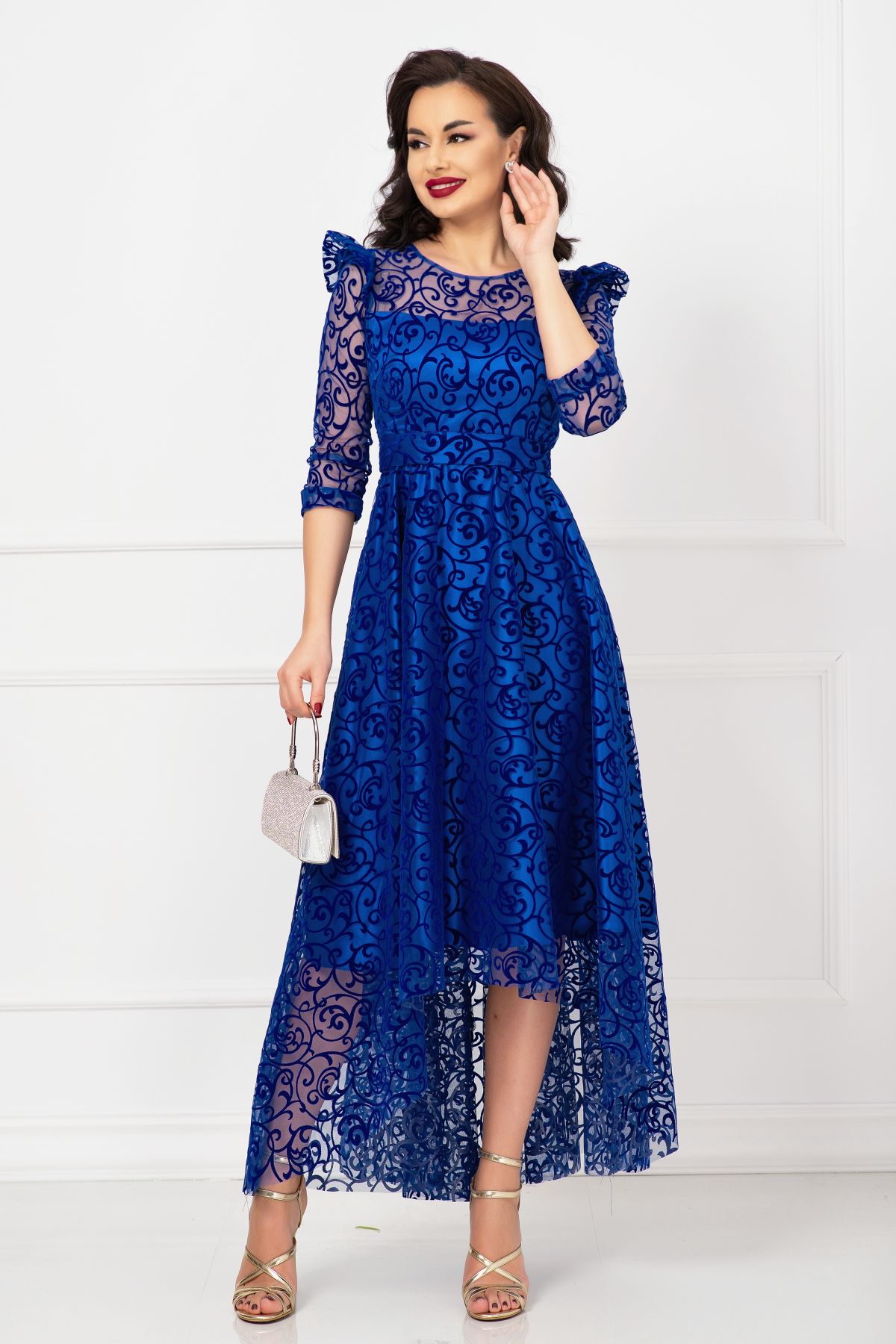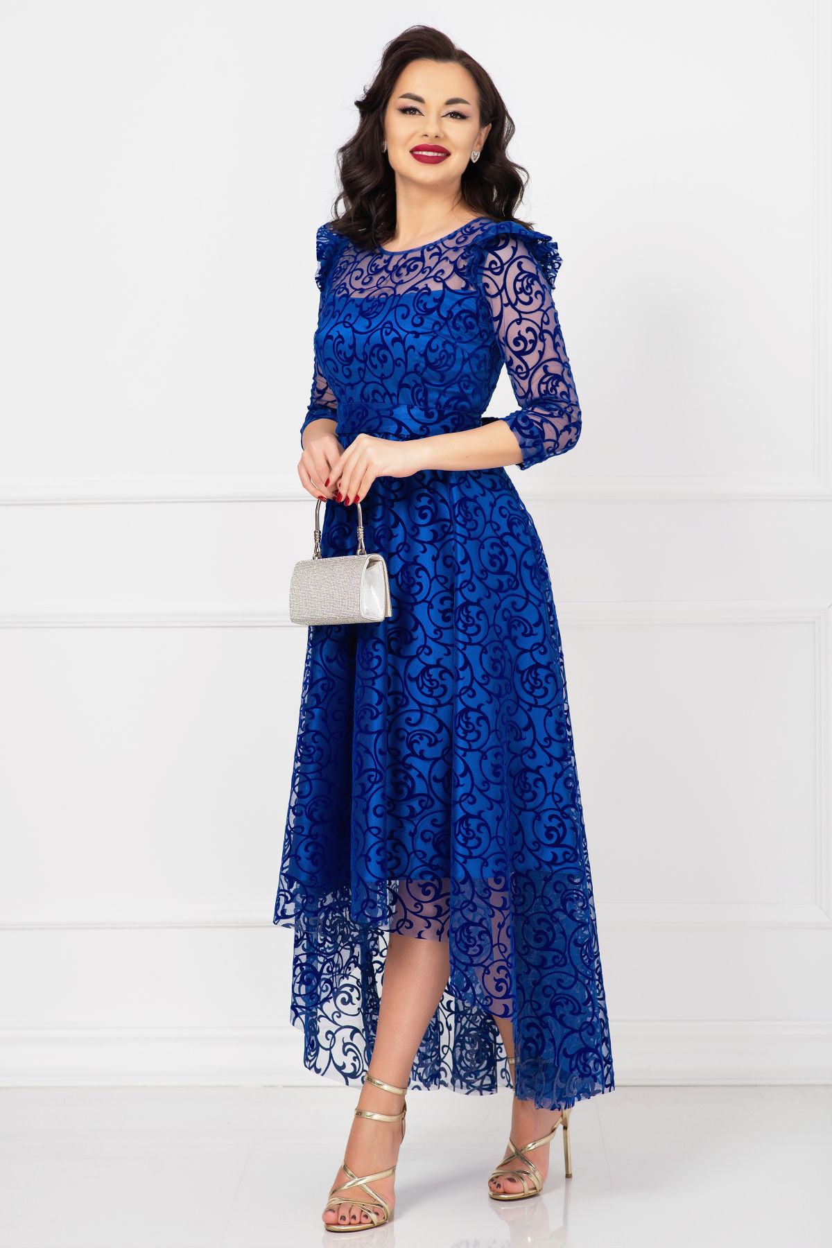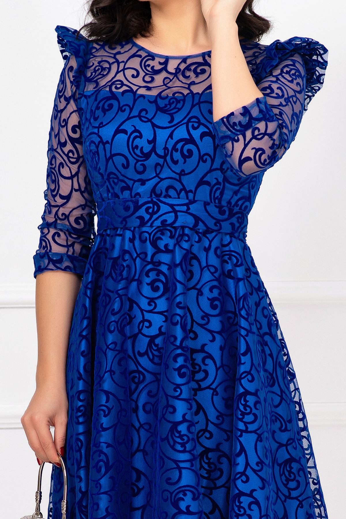 Rochie asimetrica de ocazie albastru royal Francesca cu model din catifea ; Culoare: albastru royal ; Croi: asimetric ; Prezinta dublura din satin ; Maneci trei sferturi ; Decolteu rotund ; Inchidere cu fermoar la spate ; Volane la umeri ; Cordon detasabil in talie ; Model deosebit din catifea pe toata suprafata ; Compozitie: 100% poliester ; Fabricat in Romania ; * Echipa noastra face toate eforturile in a prezenta cat mai bine culorile produselor prezentate pe site insa culorile pot diferi de situatia reala si pot varia în functie de setarile monitorului/dispozitivului dvs!