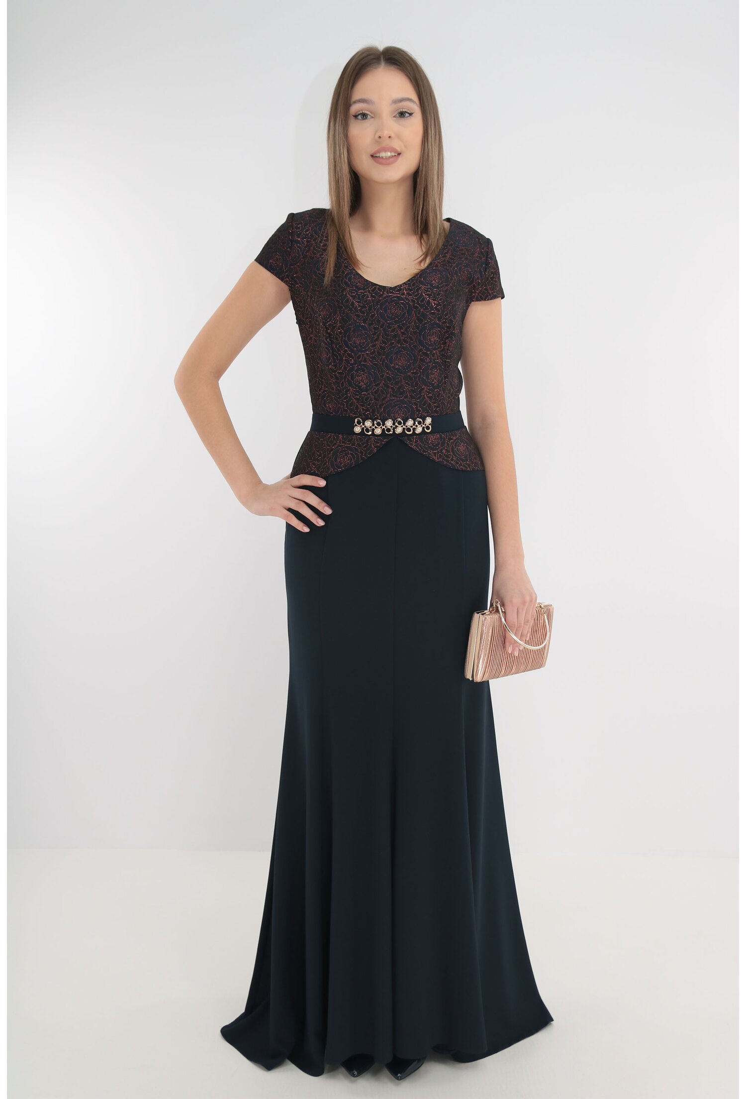 -Rochie de seara din brocard bleumarin si triplu voal -Bust din brocard bleumarin cu flori roz si fir metalic -Anchior in fata -Maneci scurte -Fermoar ascuns la spate -Cordon cu aplicatii cu perle in talie -Fusta lunga tip sirena cu trena, captusita -Fabricat in Romania MATERIAL: 40% Vascoza, 60% Poliester LUNGIME: 160 cm la marimea 40, lungimea rochiei creste cu 1 cm la fiecare marime