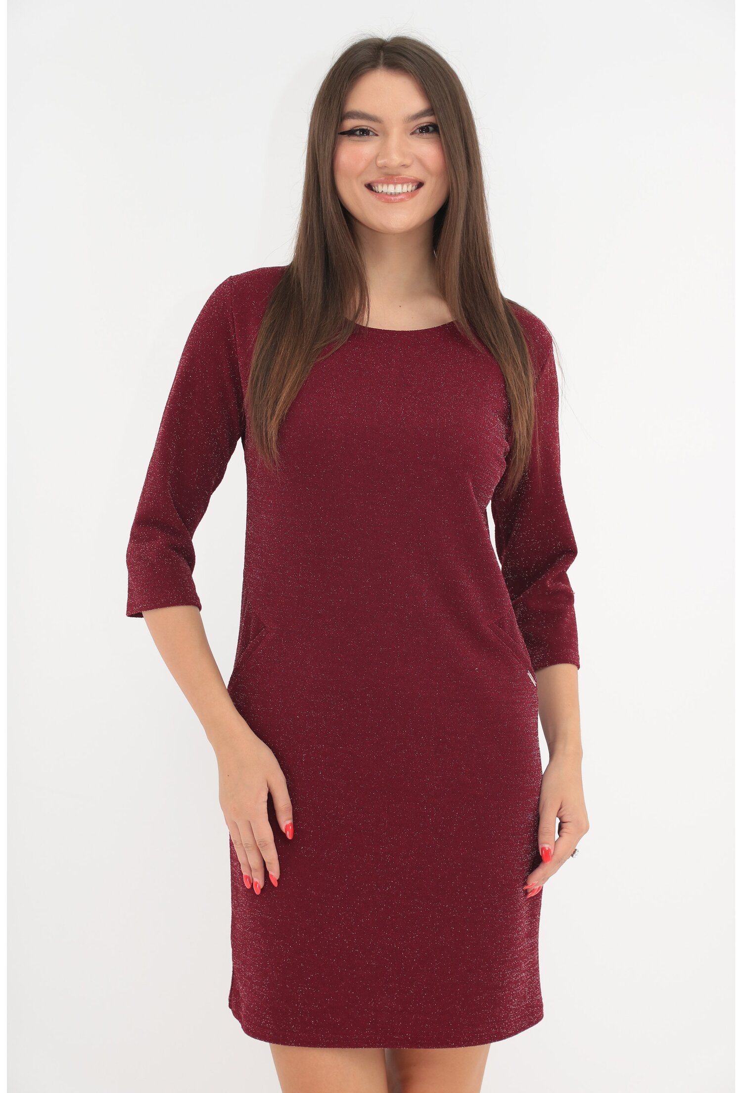– Rochie eleganta bordo cu fir stralucitor – Croiala dreapta – Confectionata din jerse elastic – Decolteu rotund – Refilet aparent in zona taliei cu accesoriu argintiu – Maneci 3/4 MATERIAL: 95% Poliester, 5% Elastan LUNGIME: 95 cm la marimea 38, creste cu 2 cm la fiecare marime