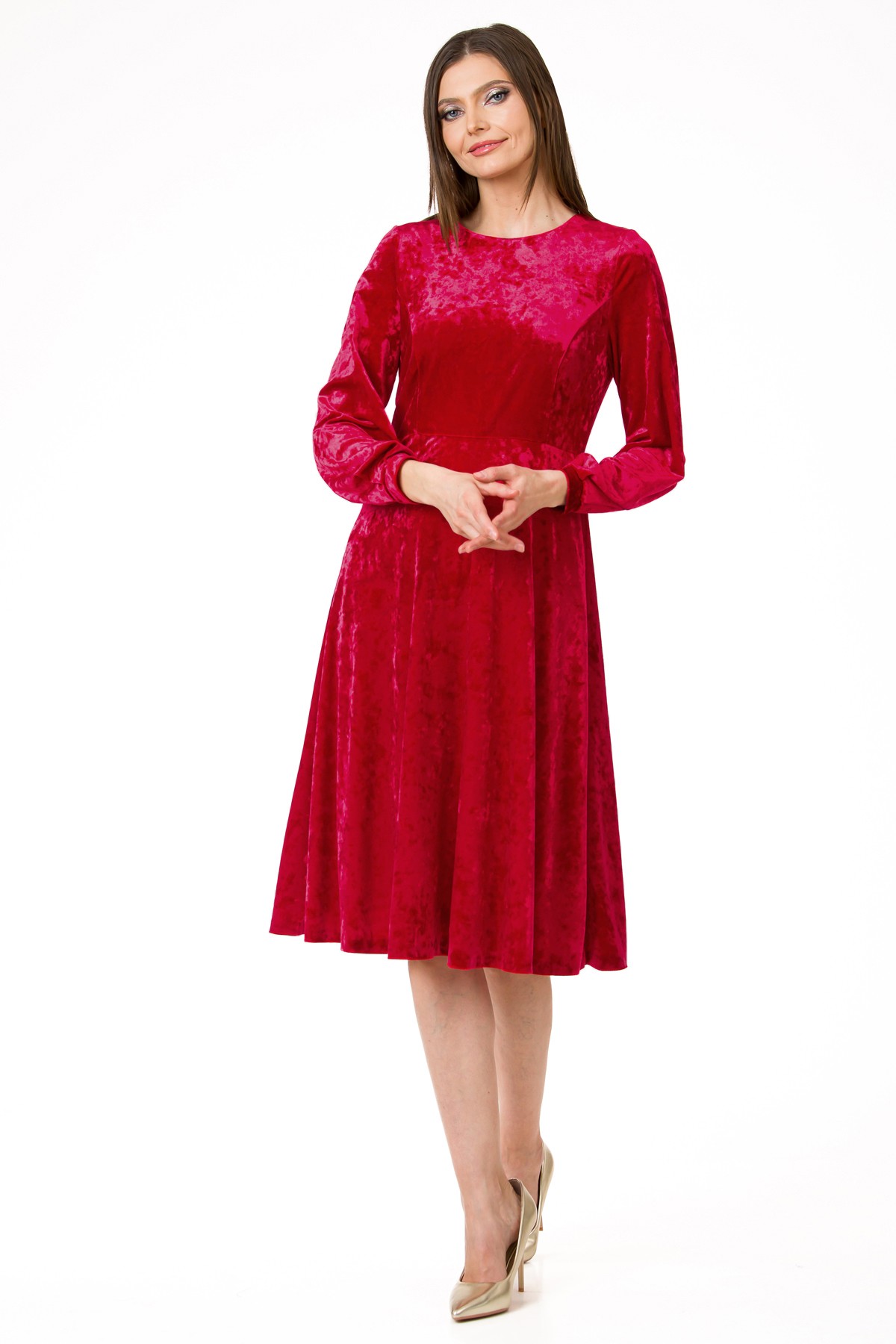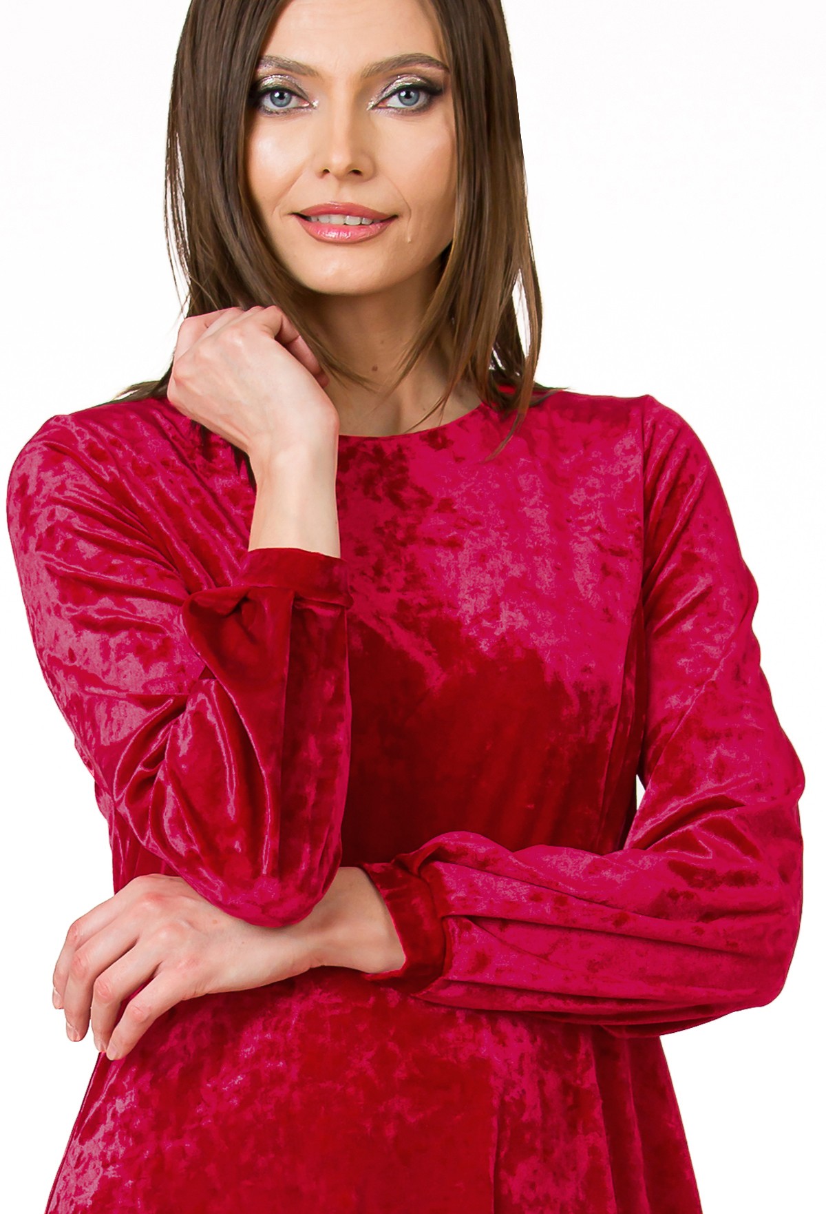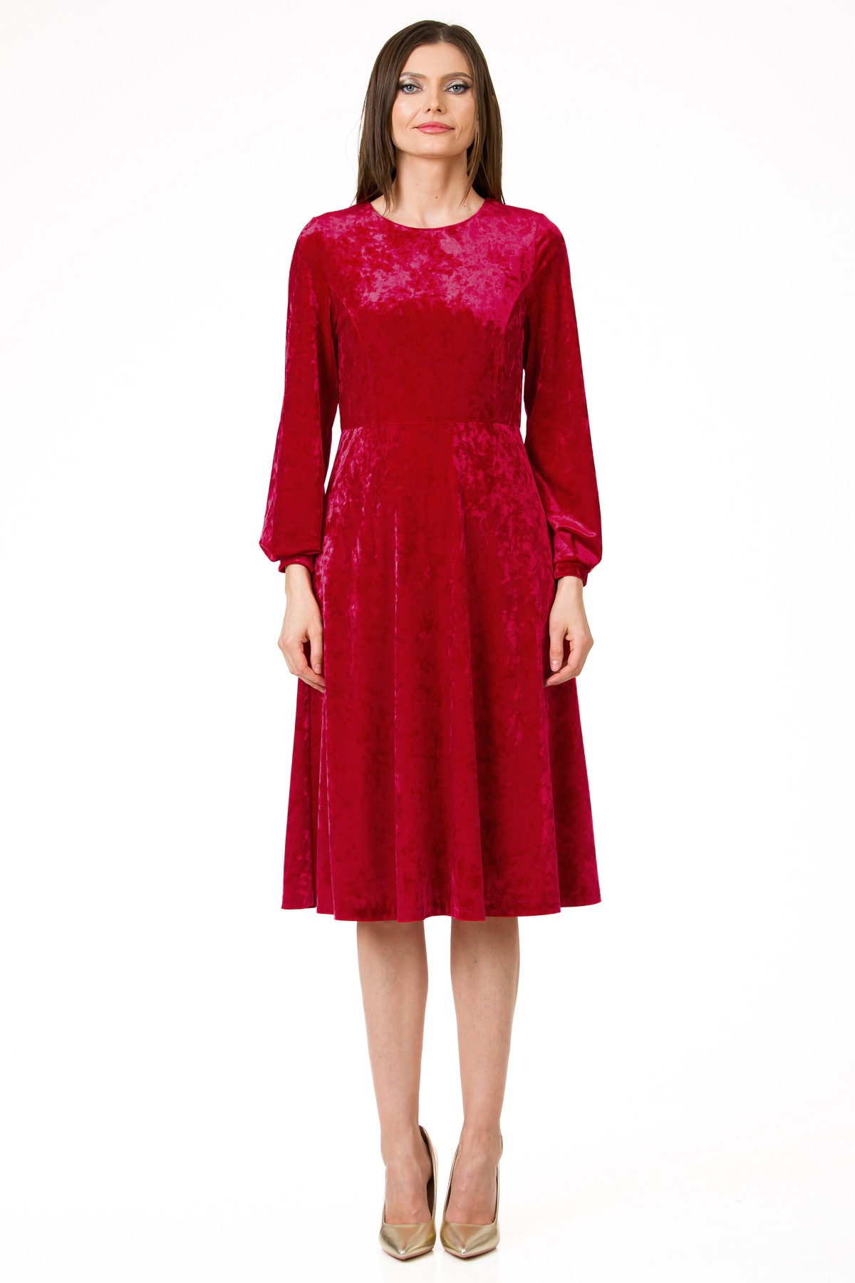Rochie Velvet Touch din catifea, croi feminin cu fusta ampla de lungime midi si maneci cu mansete fine. Tesatura necesita spalare cat mai delicata, recomandam spalare manuala, fara storcere si uscare pe orizontala.