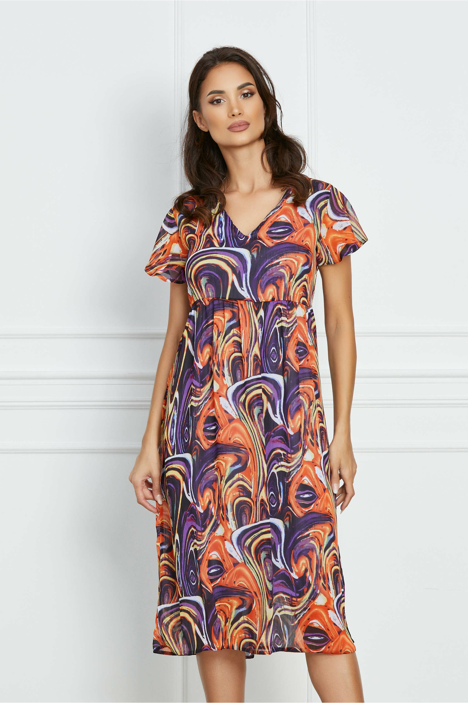 Rochie midi vaporoasa din voal. Are decolteu rotund, maneci scurte si croi clos. Rochie midi vaporoasa Decolteu in V Maneci scurte Croi clos Captusita pe interior Fara inchidere Material: Voal Compozitie: 95% Poliester, 5% Elastan Instructiuni de intretinere: *Va rugam verificati eticheta produsului inainte de curatare! *Pozitia tiparului imprimeului poate fi diferita datorita taierii. *Modelul are inaltimea de 174 cm. *Va rugam sa retineti ca o usoara discrepanta de culoare ar trebui sa fie acceptabila datorita luminii si luminozitatii ecranului. *Va rugam verificati ghidul de marimi, in cm, pentru a alege corect marimea.