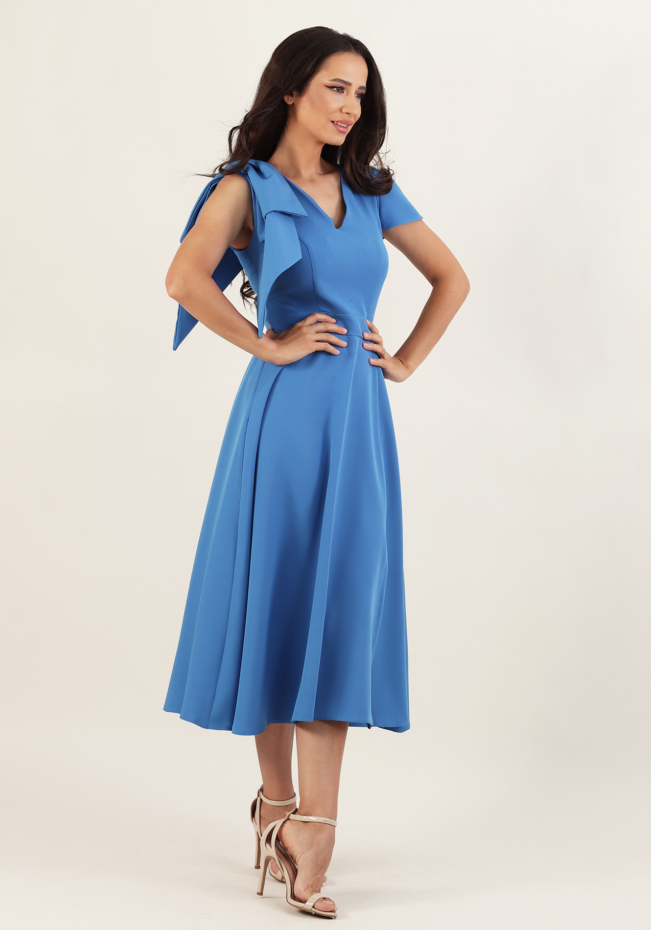 Rochie clos cu decolteu V in fata si in spate,o maneca scurta cu cret in zona umerilor,bustul cambrat accesorizat cu funda maxi la umar,taiata in talie cu banta,fusta clos cu crepeu pe picior,fara captusala,inchidere la spate cu fermoar ascuns.Material stofa