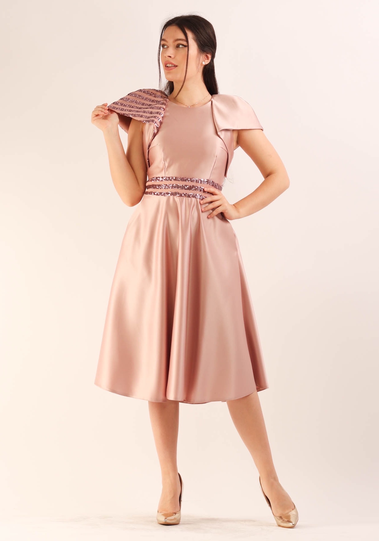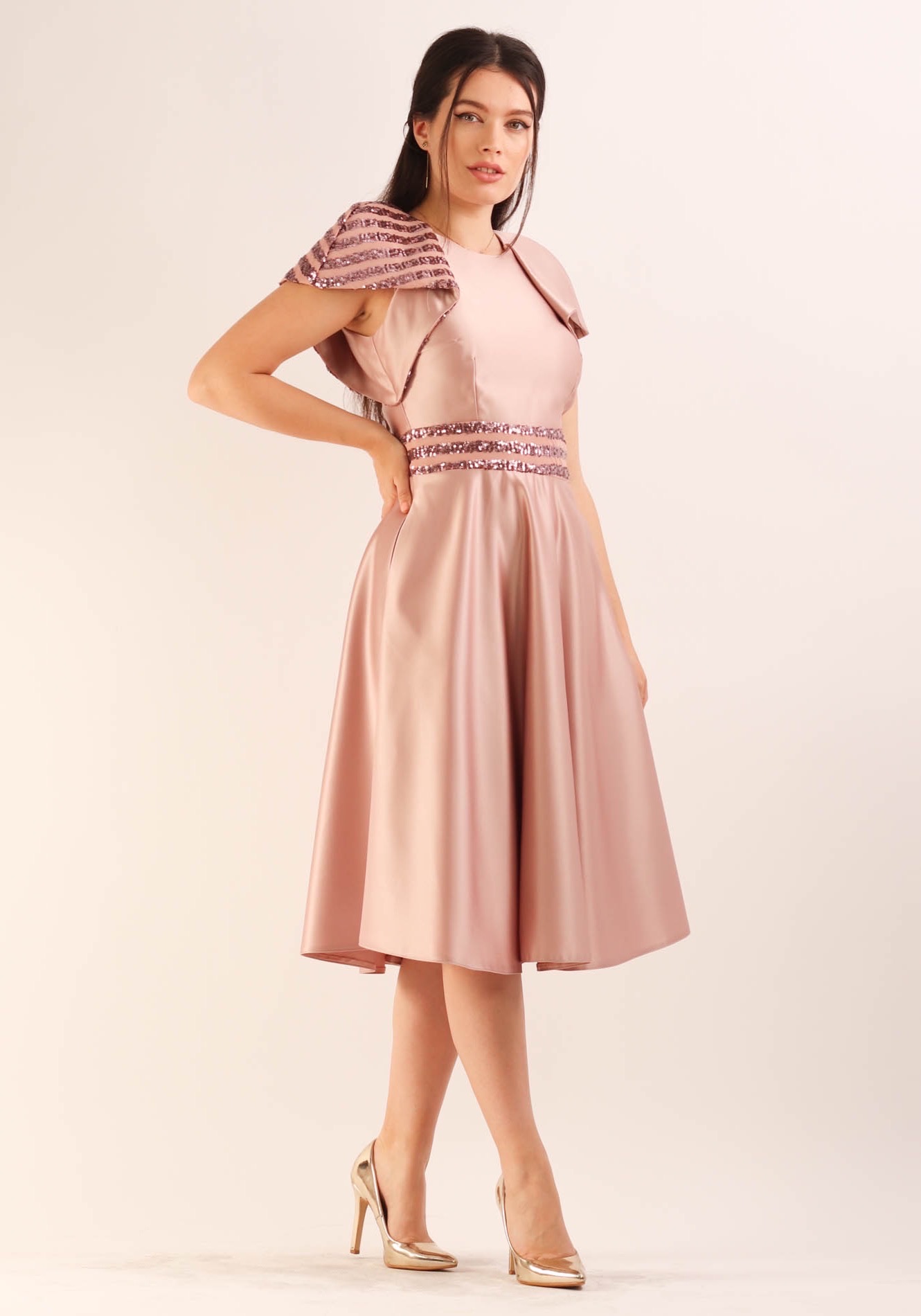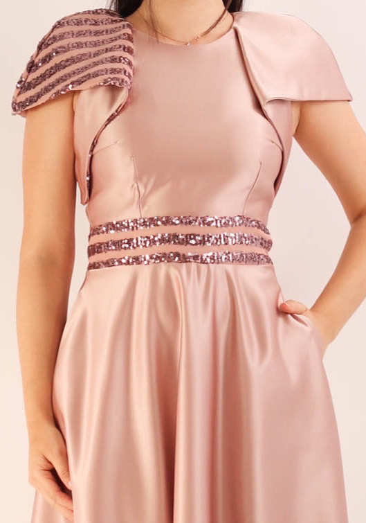 Rochie clos cu decolteu rotund in fata si in spate,maneca scurta,bustul cambrat,taiata in talie cu banta,fusta clos cu buzunare functionale,captusita la bust,inchidere la spate cu fermoar ascuns