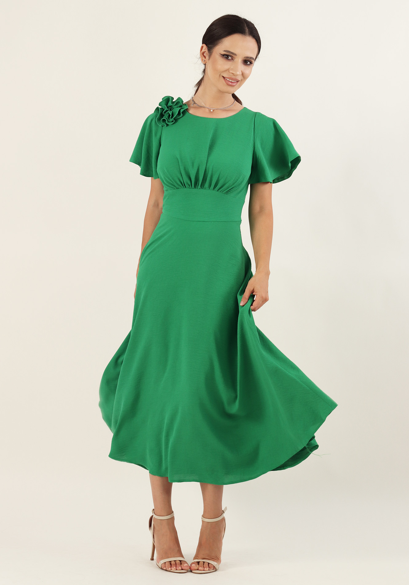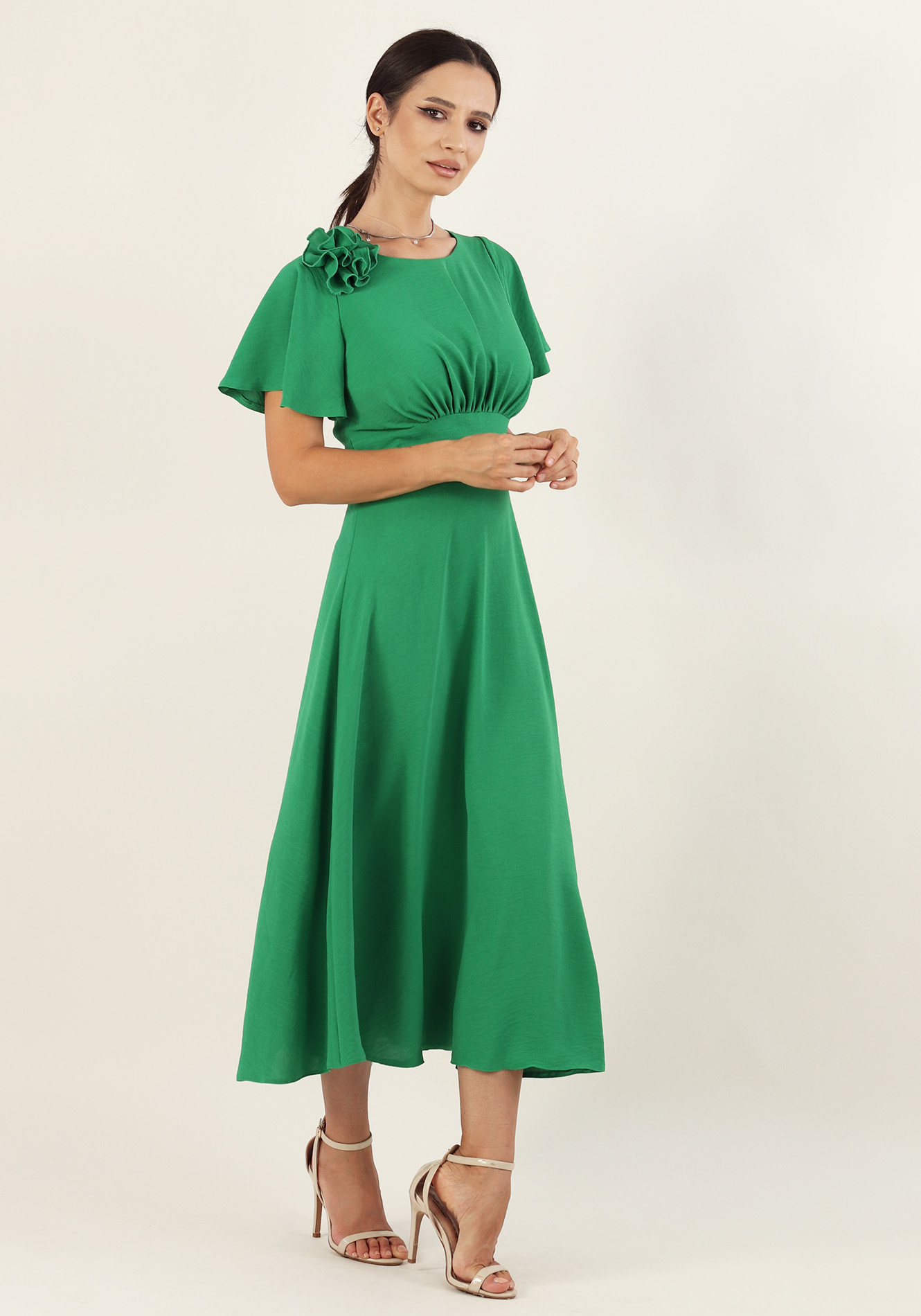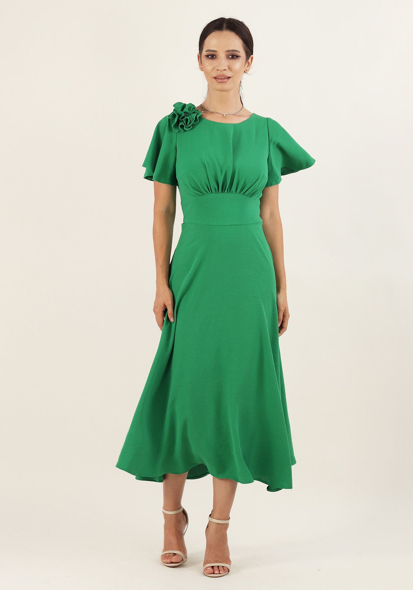 Rochie clos cu decolteu rotund in fata si in spate,maneca scurta,trandafir decorativ pe o parte,bustul cu cret in talie,taiata in talie cu banta,fusta clos,captusita la bust,inchidere la spate cu fermoar ascuns.Material crep