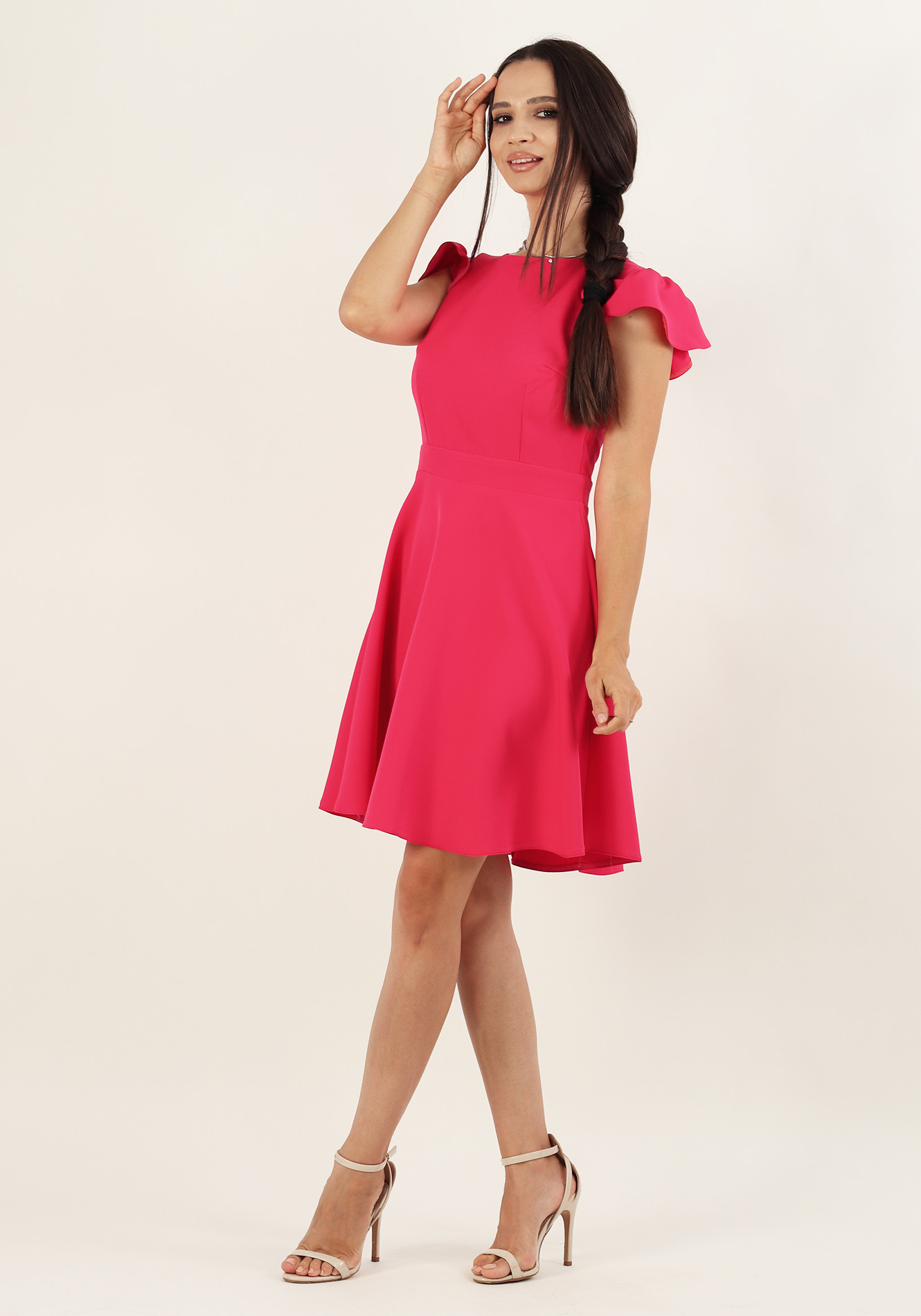 Rochie clos cu decolteu rotund in fata si V in spate,maneca scurta cu cret in zona umerilor,bustul cambrat,taiata in talie cu banta,fusta clos,fara captusala,inchidere la spate cu fermoar si nasturi.Material stofa
