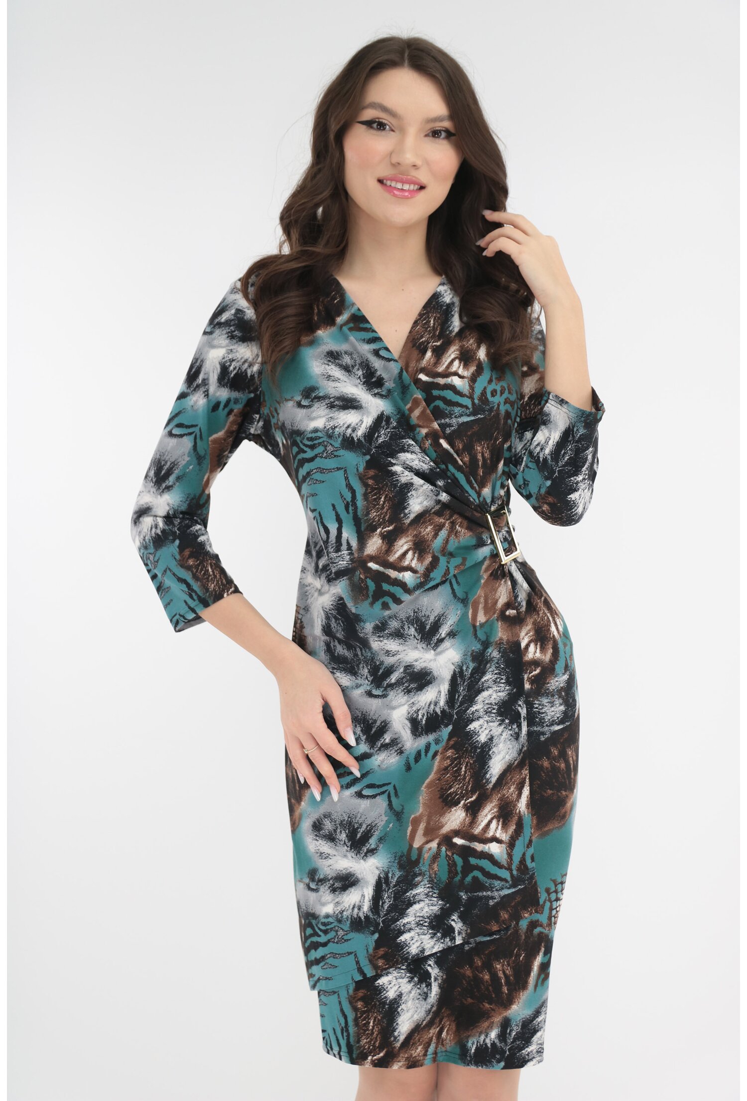 Rochie cocktail cu print abstract maro-turcoaz si accesoriu in talie