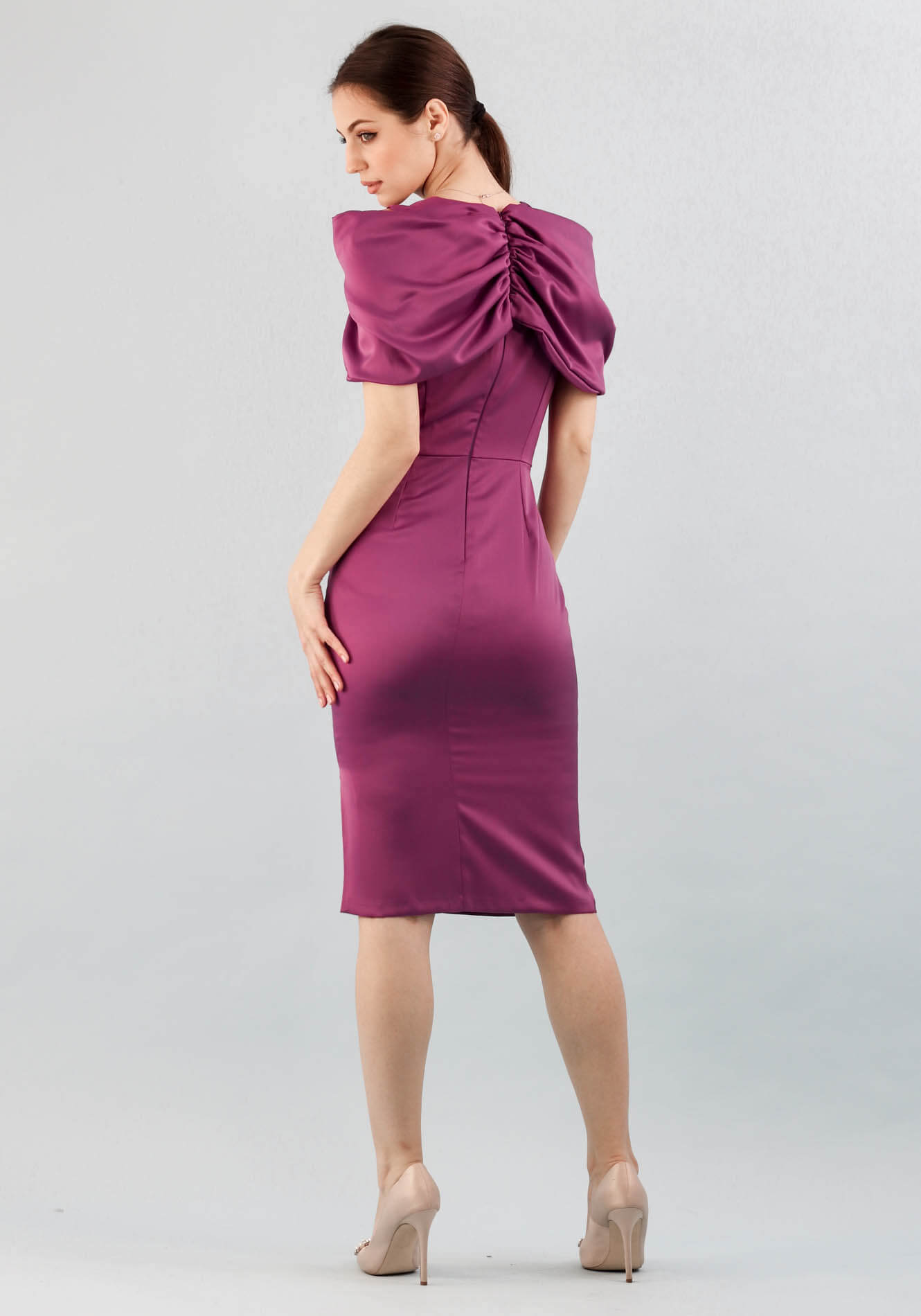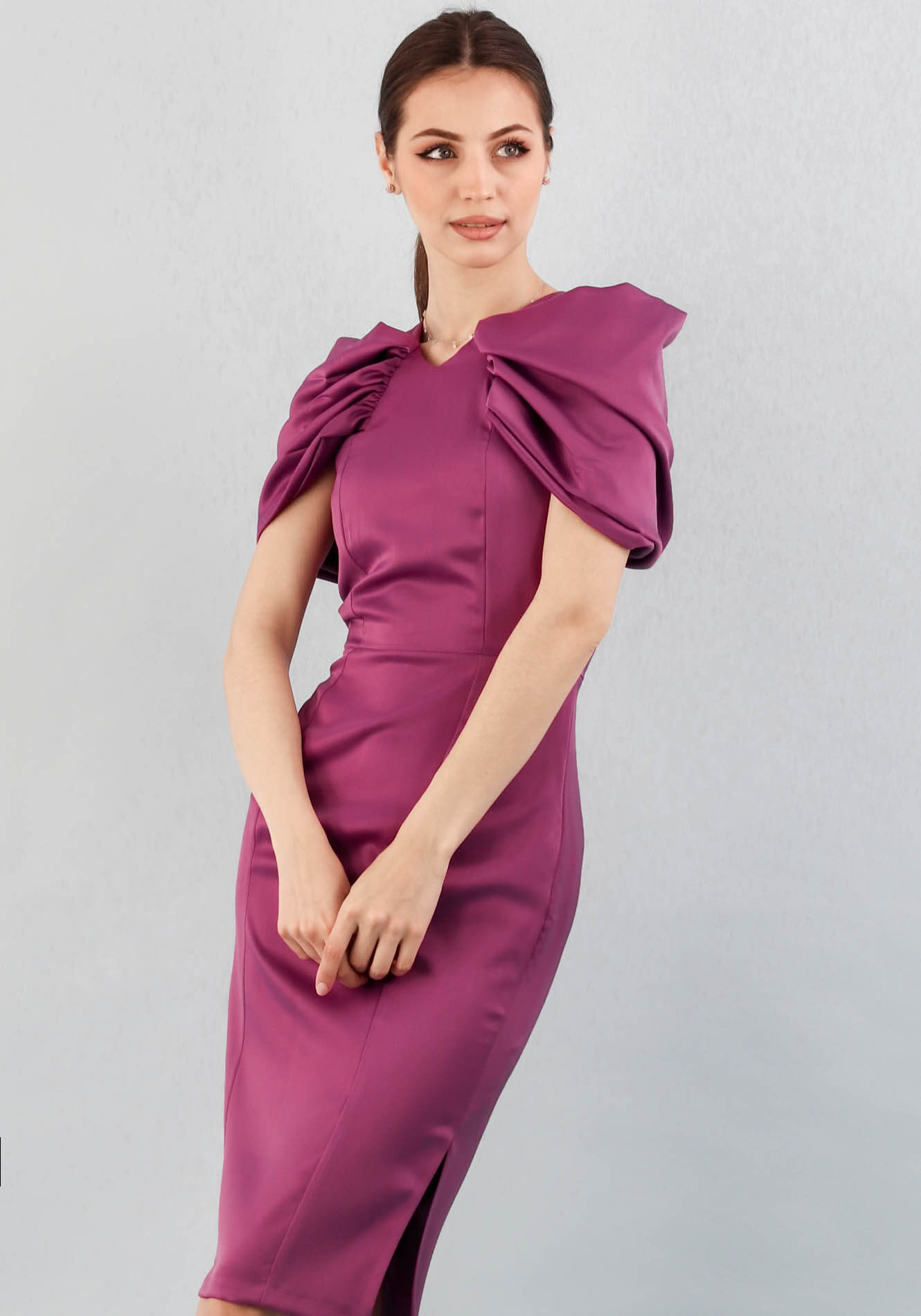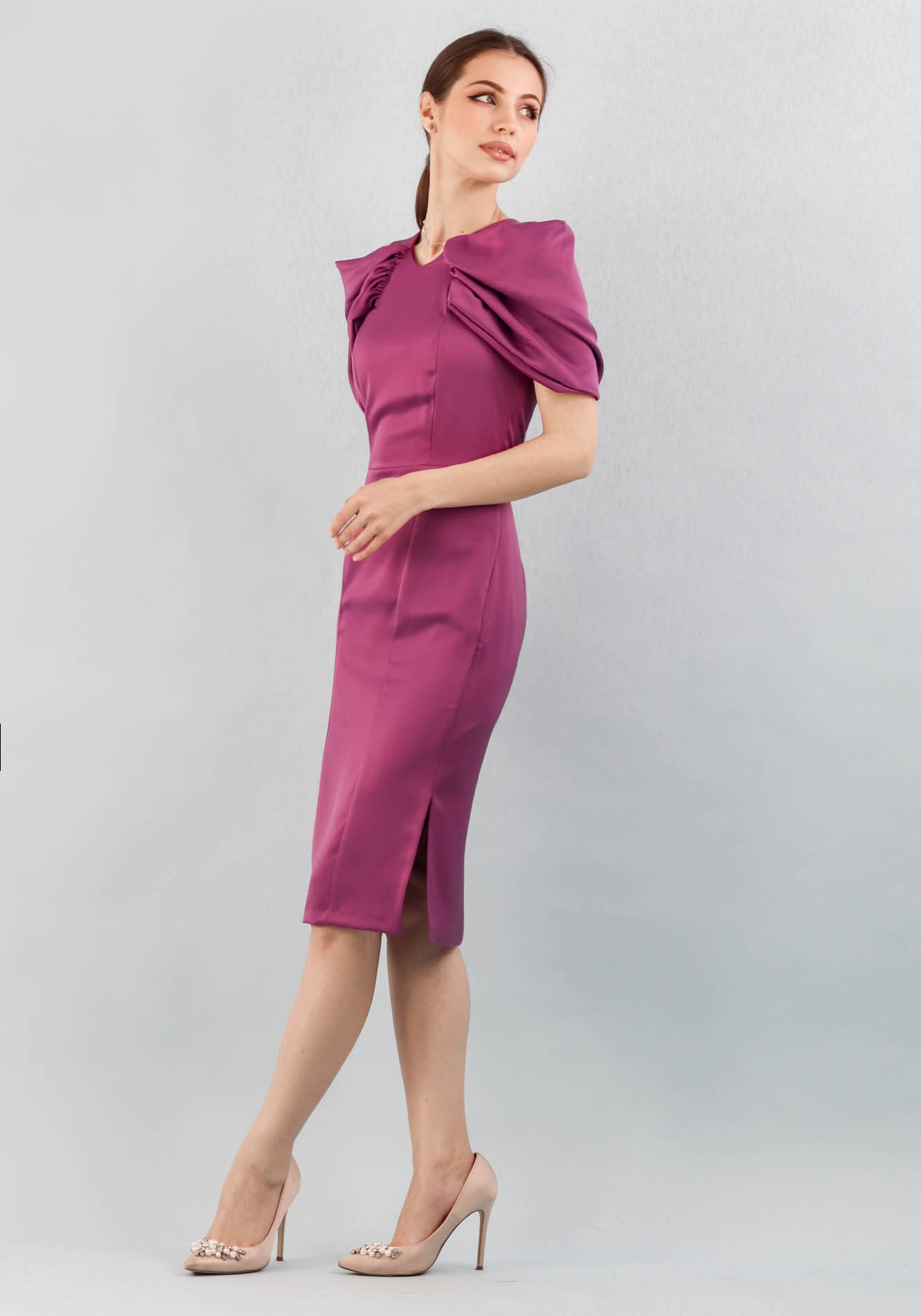Rochie cu decolteu tip V in fata si rotund in spate,bustul cambrat accesorizat cu esarfa maxi cu cret fata/spate integrata in cusatura,taiata in talie,fusta conica cu crepeu pe lateral,captusita,inchidere la spate cu fermoar ascuns