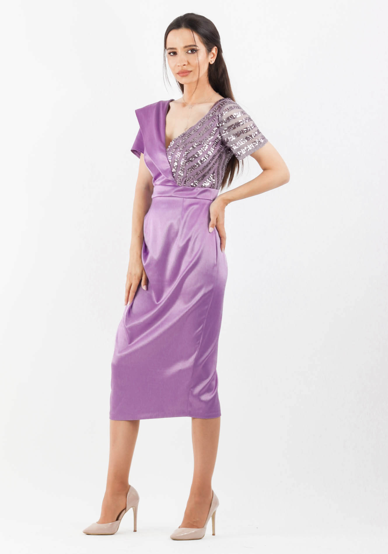 Rochie cu decolteu tip V in fata si in spate accesorizat cu volan pe o parte integrat in cusatura,bustul cambrat,maneca scurta cu cret in zona umerilor,taiata in talie cu banta,fusta conica cu pliuri pe lateral si crepeu la spate,captusita la bust, inchidere la spate cu fermoar ascuns