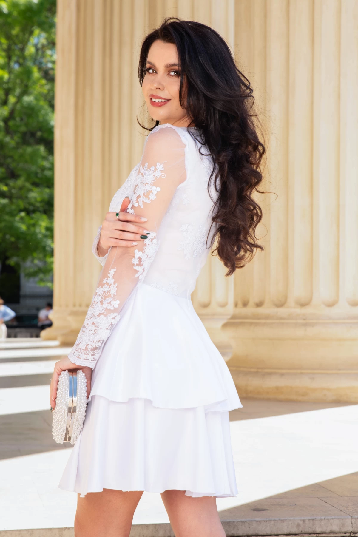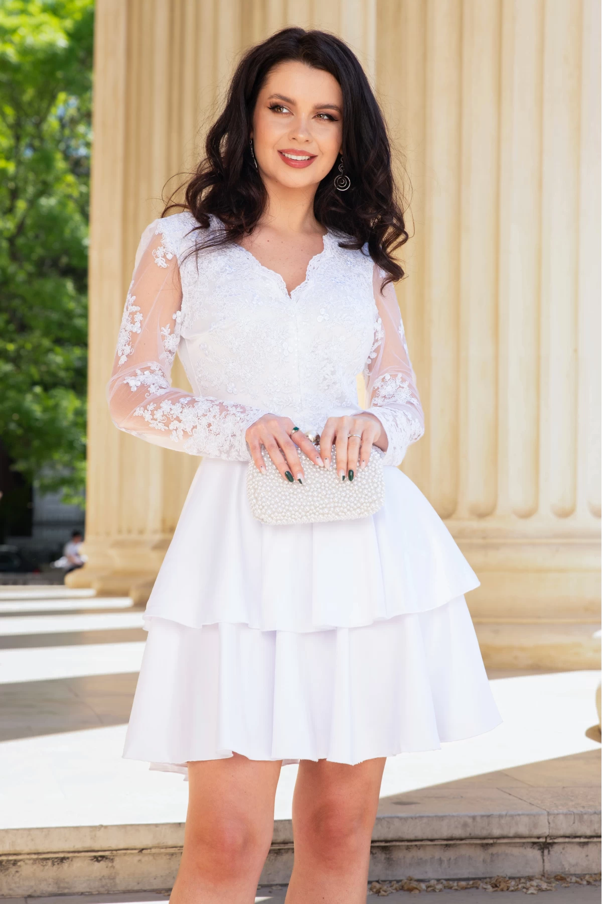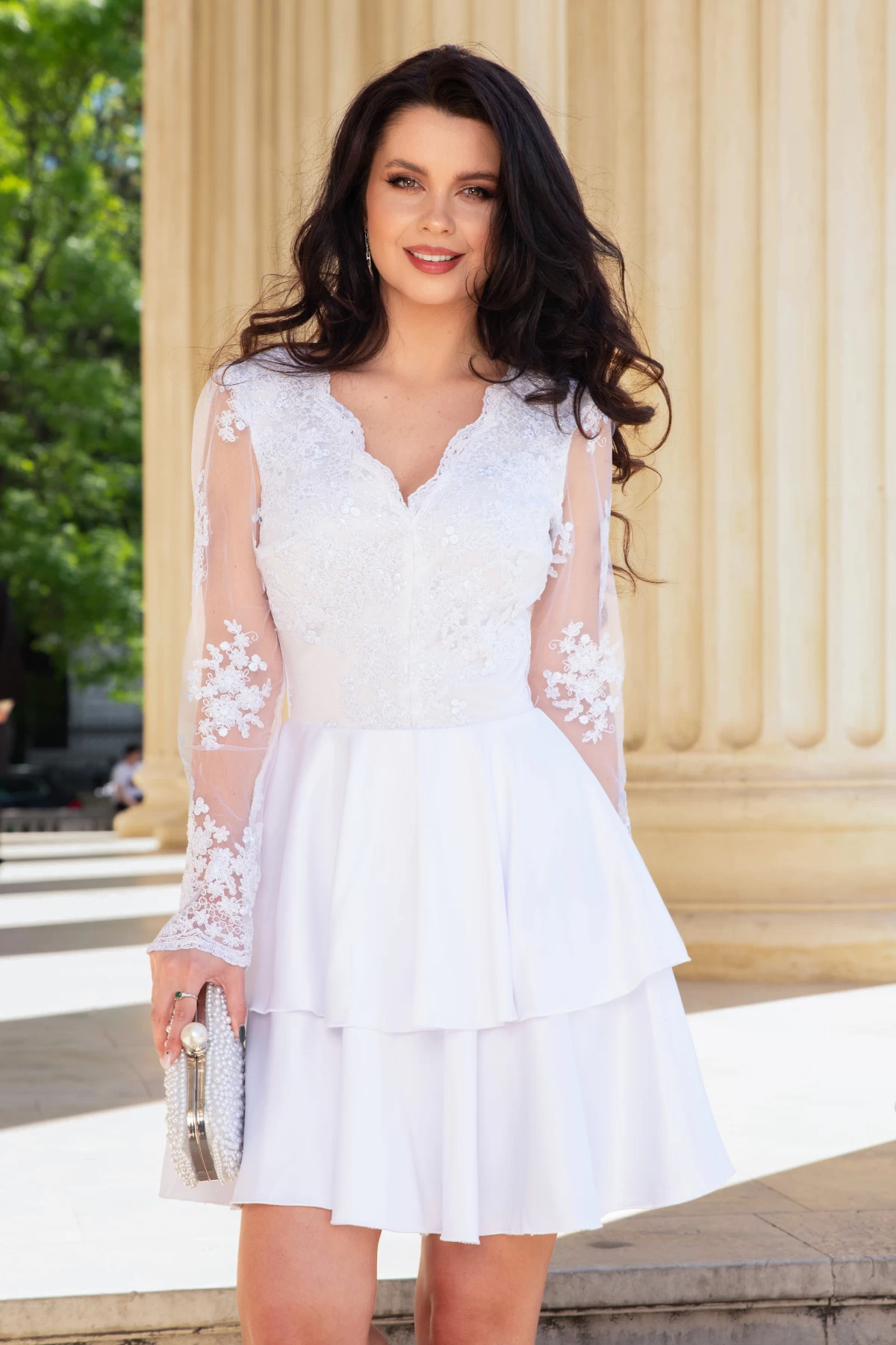 Rochie cununie civila eleganta cu dantela ; Rochie alba mini cu volane ; Volane elegante ; Maneci lungi din tulle brodat ; Decolteu in V ; Dublata in partea de sus ; Dantela alba fashion aplicata in partea de sus si pe maneci ; Inchidere cu fermoar la spate ; Compozitie: 95% poliester 5% elastan ; Fabricat in Romania ; * Echipa noastra face toate eforturile in a prezenta cat mai bine culorile produselor prezentate pe site insa culorile pot diferi de situatia reala si pot varia în functie de setarile monitorului/dispozitivului dvs!