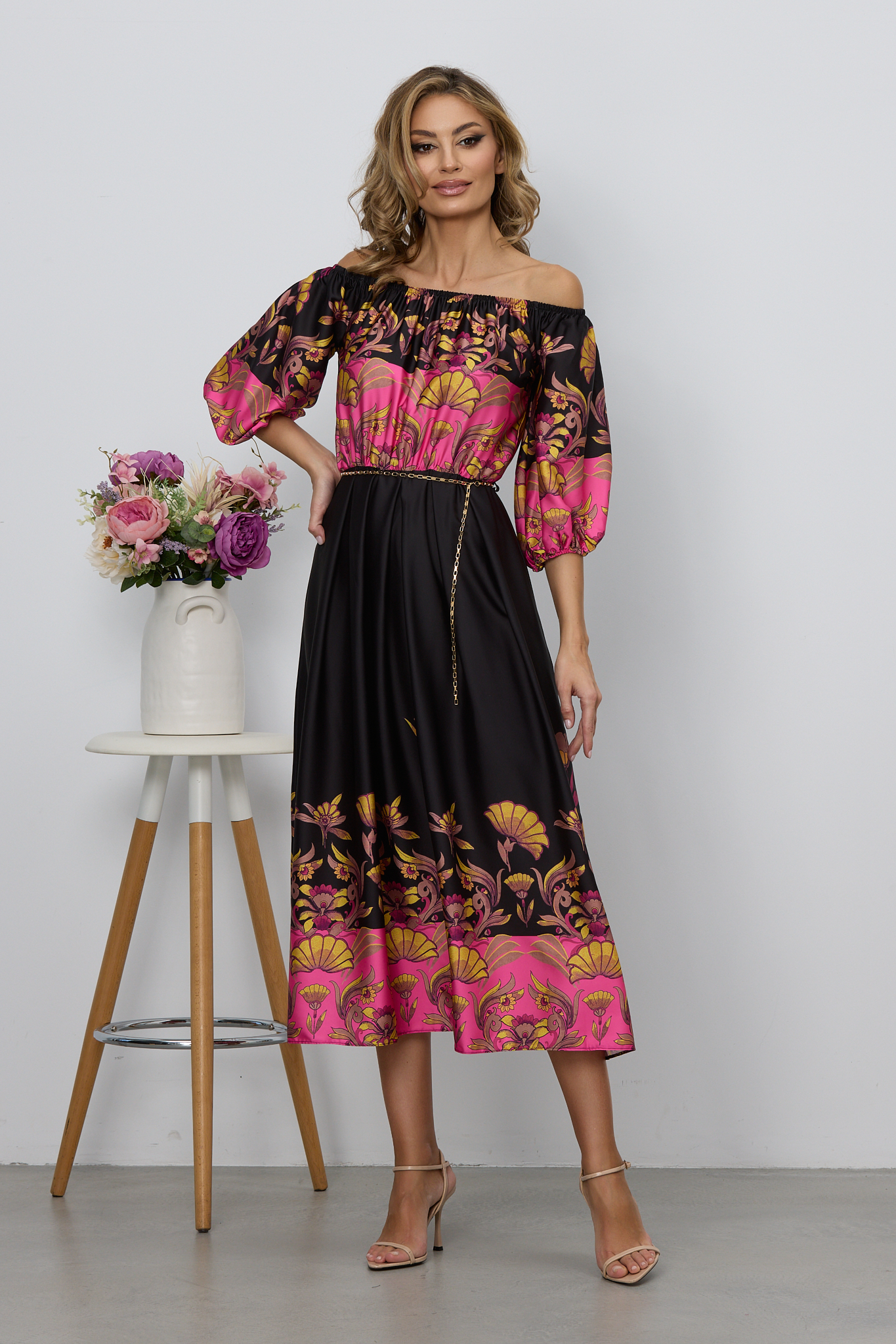 Rochie eleganta neagra midi din satin cu imprimeu floral, are un design simplu, dar in acelasi timp chic. Croiul lejer si materialul vaporos te vor face sa te simti confortabil la orice eveniment urmeaza sa participi. material neelastic fermoar la spate decolteu prevazut cu elastic imprimeu floral maneci trei sferturi fara jupon Dimensiuni disponibile: S, M, L