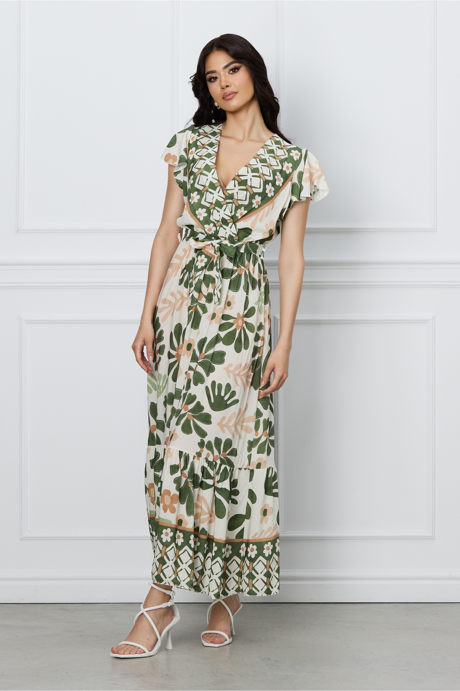 Comandă o Rochie Daria ivory cu imprimeuri verzi si cordon in talie cu LIVRARE și RETUR GRATUIT!