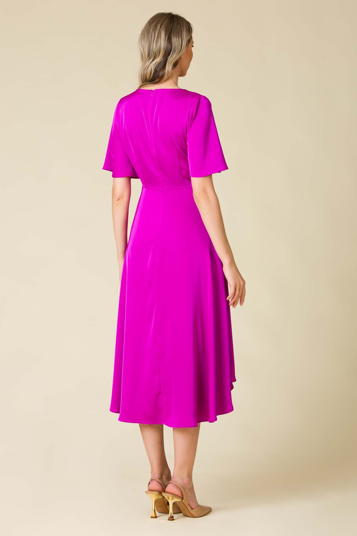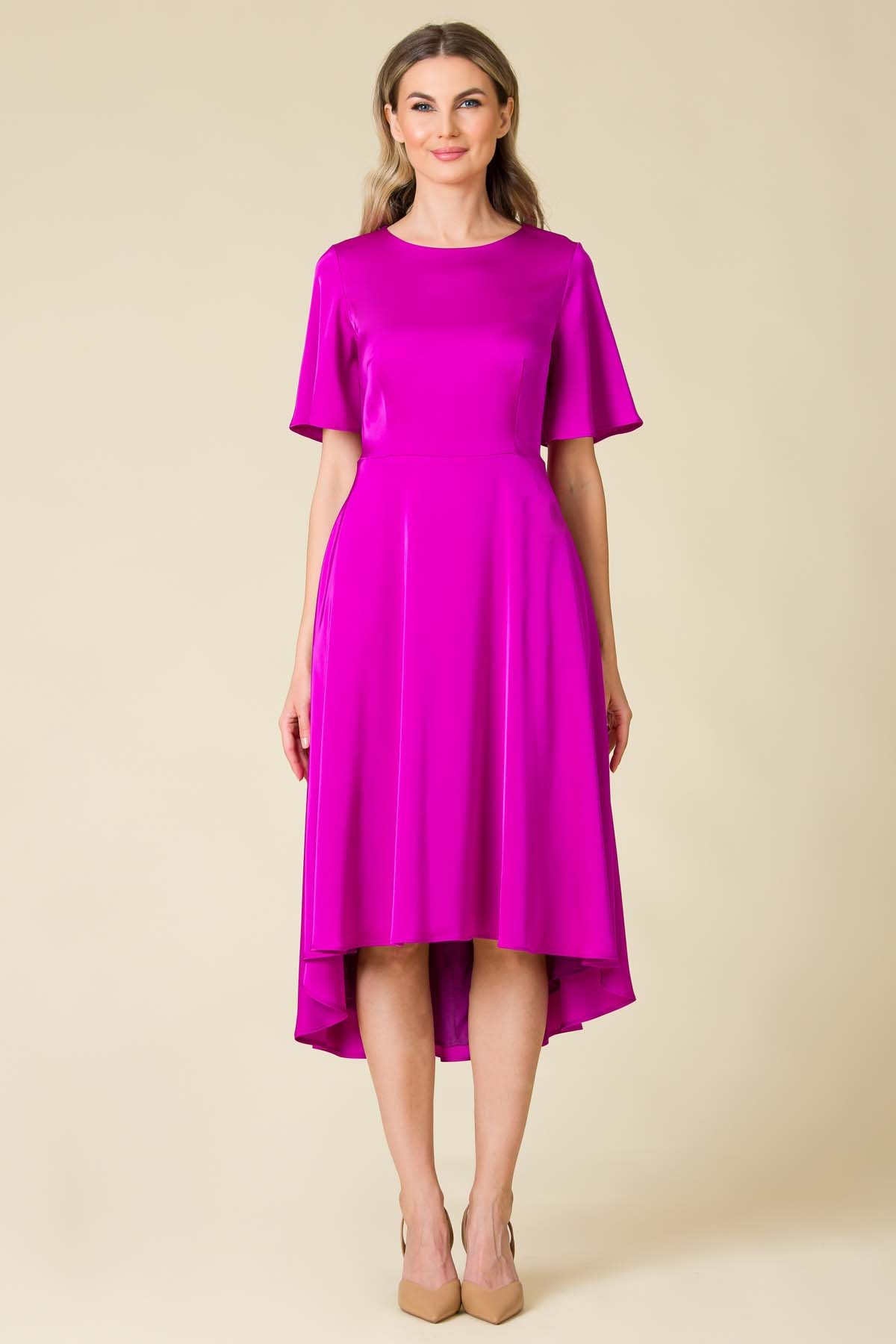 Rochie de ocazie Aurora din tesatura satinata, croi feminin cu fusta ampla cu trena si maneci tip clopot.