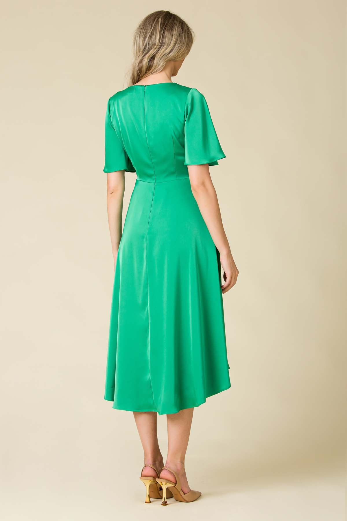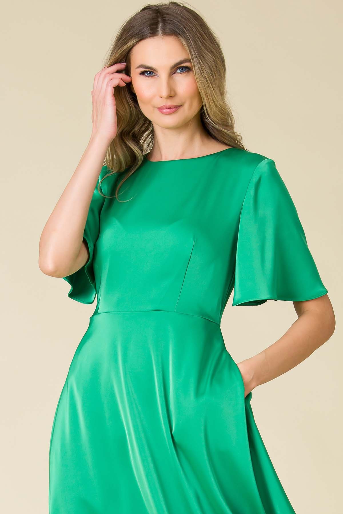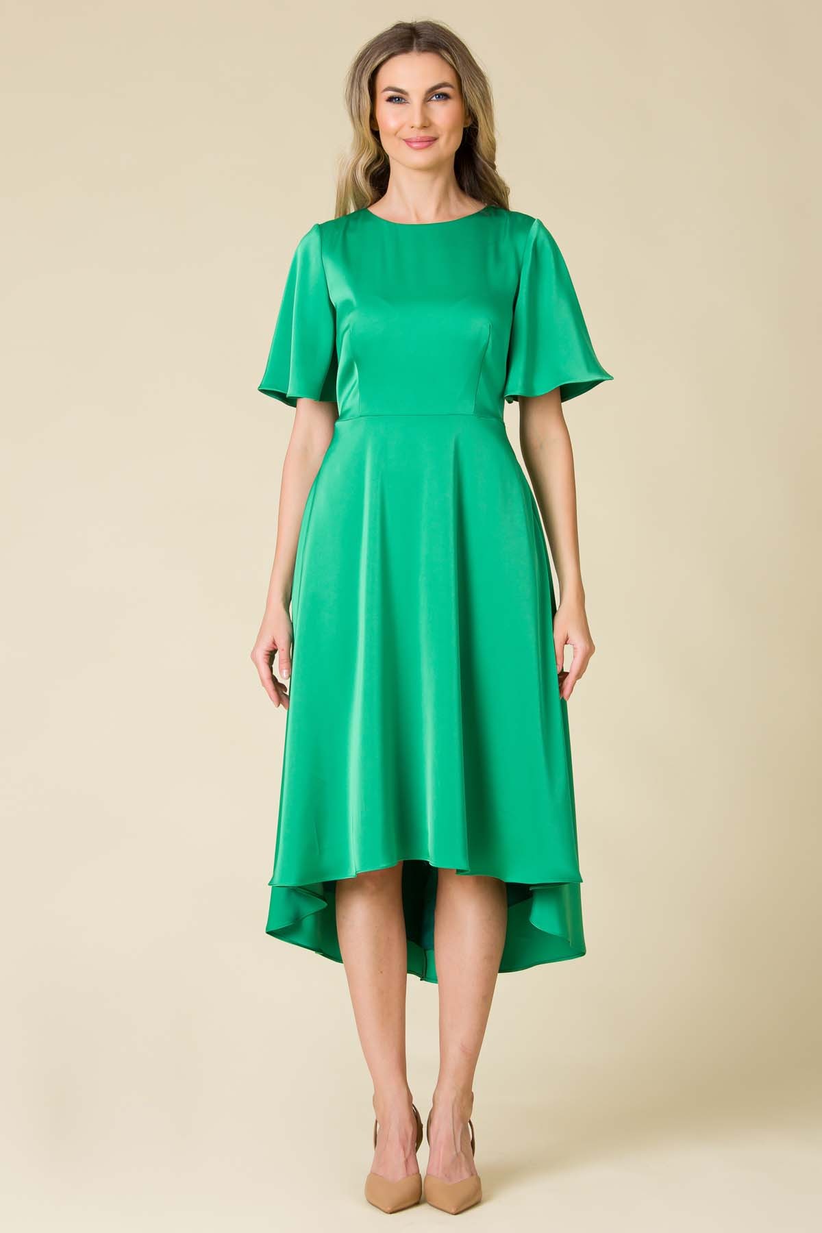 Rochie de ocazie Aurora din tesatura satinata, croi feminin cu fusta ampla cu trena si maneci tip clopot.