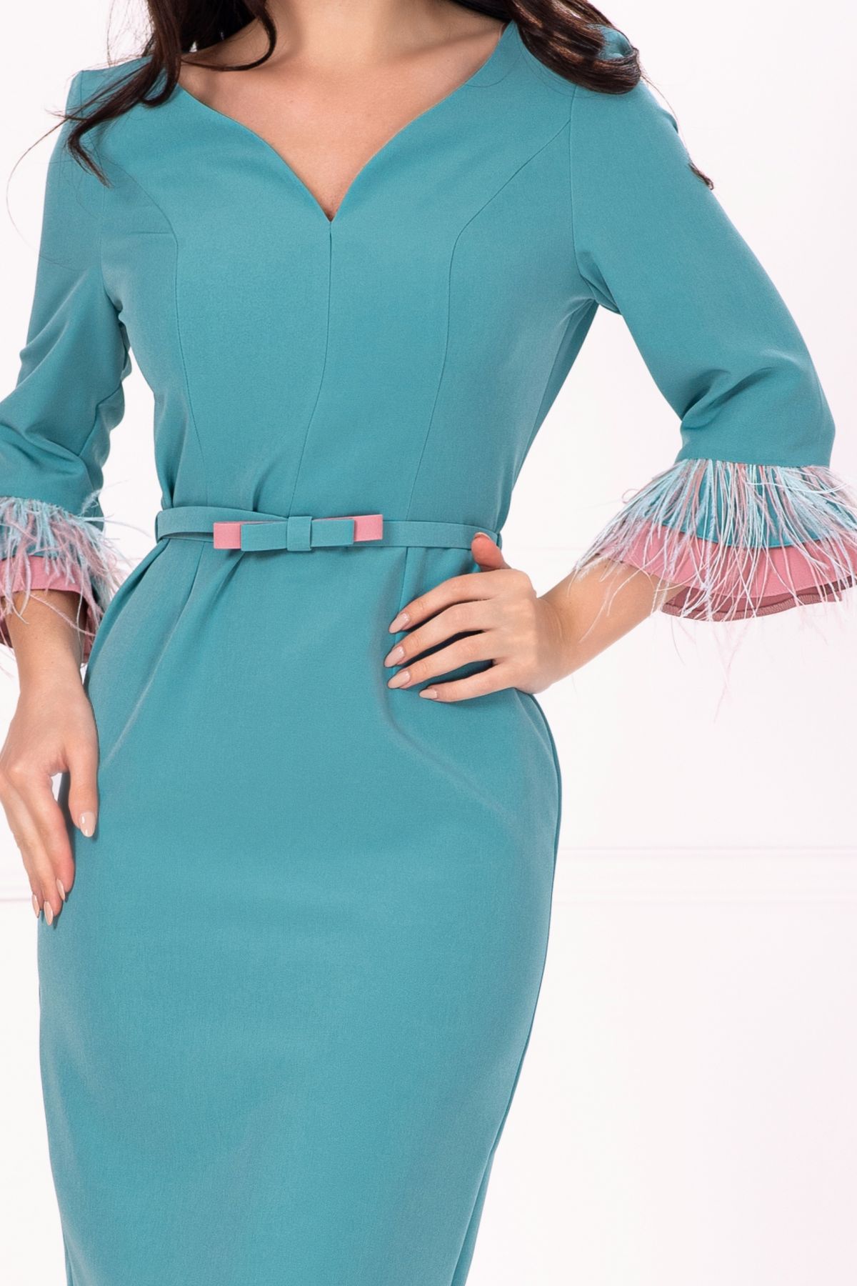 Rochie de ocazie conica cu volane si fulgi la mansete ; Culoare: bleu ; Croi: conic ; Maneci trei sferturi ; Decolteu in V ; Inchidere cu fermoar la spate ; Volanase alb-roz la maneci ; Fulgi decorativi ; Crapatura la spate in partea de jos ; Curea detasabila in talie ; Fara dublura ; Compozitie: 97% poliester 3% elastan ; Fabricat in Romania ; * Echipa noastra face toate eforturile in a prezenta cat mai bine culorile produselor prezentate pe site insa culorile pot diferi de situatia reala si pot varia în functie de setarile monitorului/dispozitivului dvs!