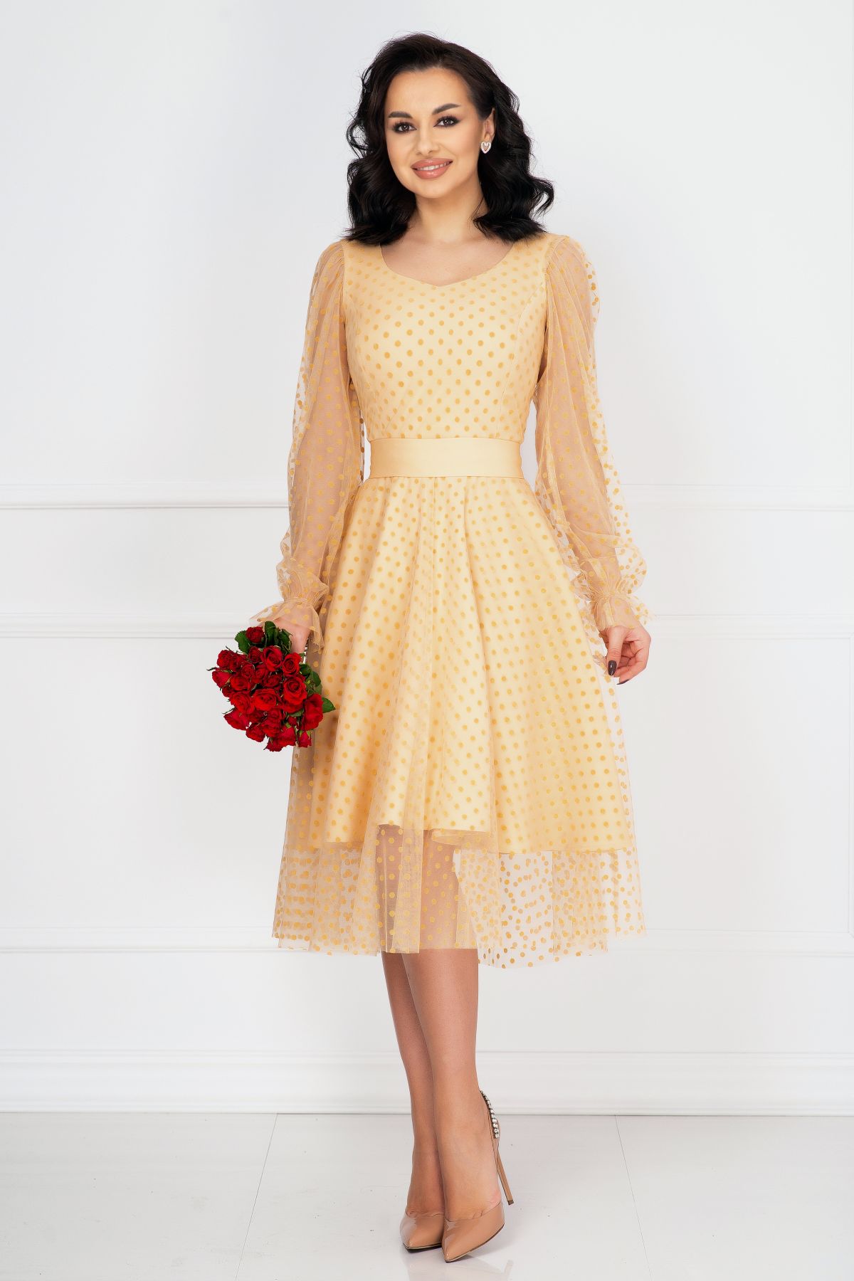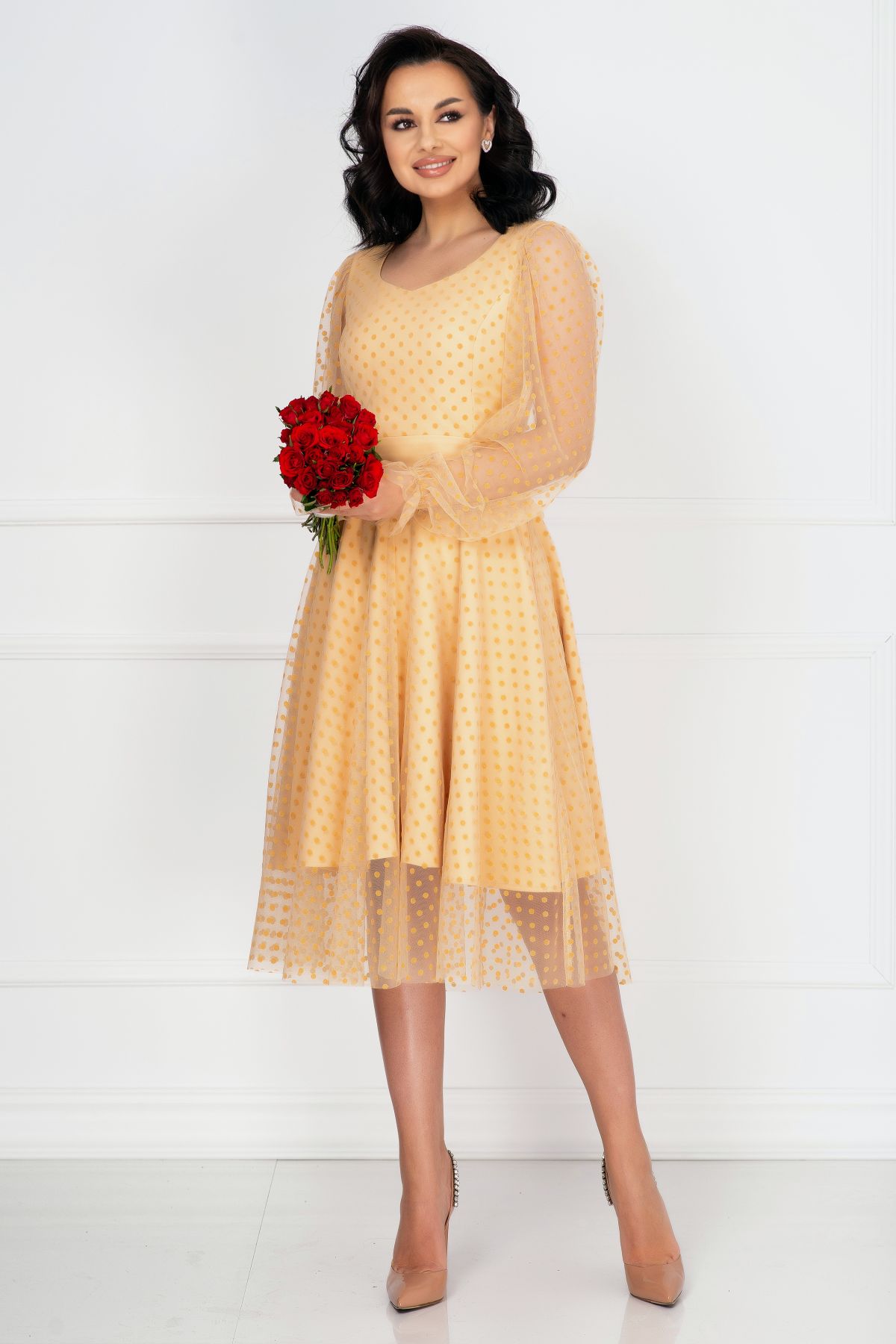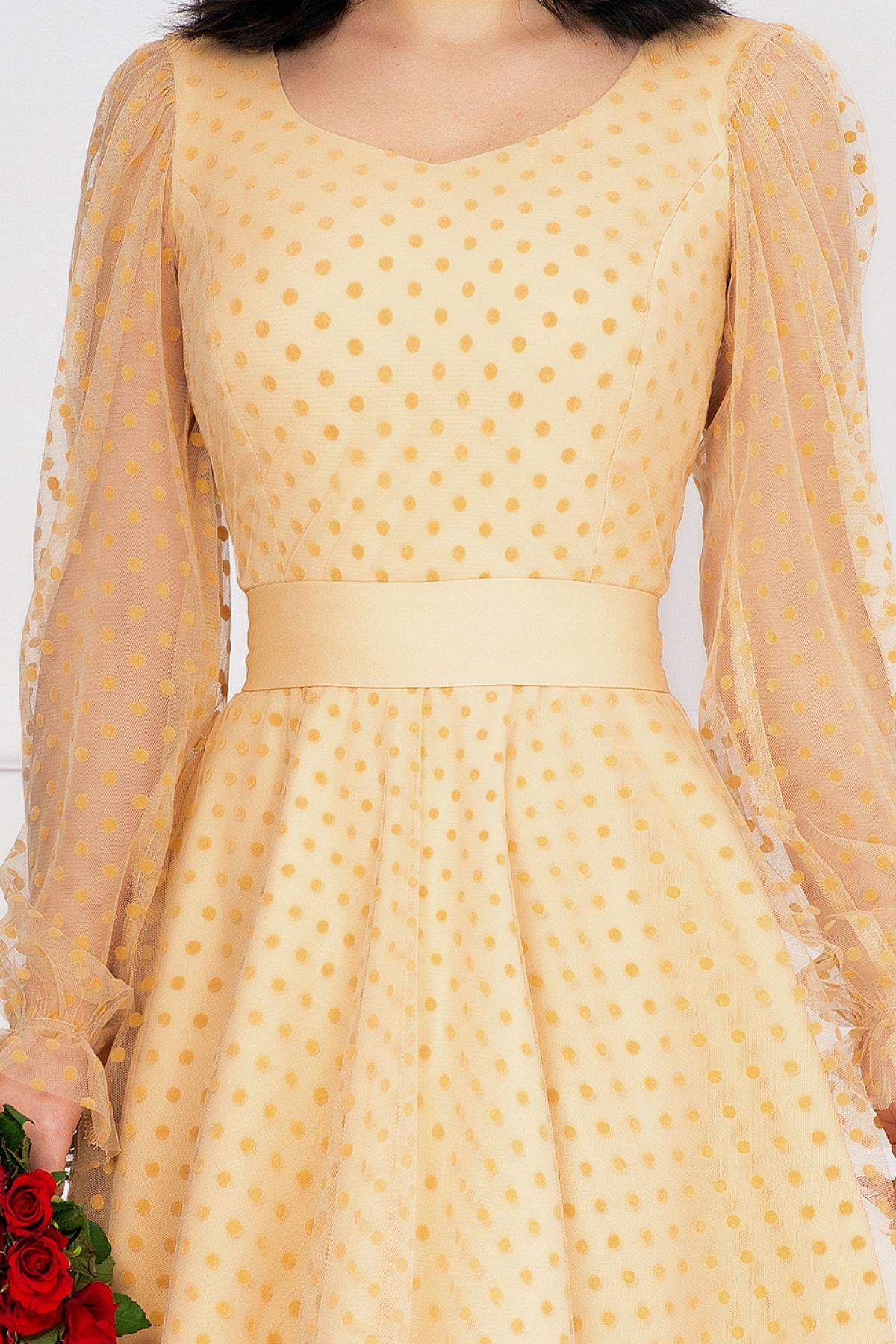 Rochie de ocazie InPuff crem acoperita de tulle cu buline ; Culoare: crem ; Croi: clos ; Material vaporos delicat la atingere ; Decolteu in V ; Inchidere cu fermoar la spate ; Maneci lungi din tul cu buline ; Fusta ampla incretita din talie ; Terminatie maneci cu elastic si volanas ; Prezinta dublura ; Tulle decorat cu buline catifelate ; Cusatura in talie ; Compozitie: 100% poliester ; Fabricat in Romania ; Exclusivitate InPuff ; * Echipa noastra face toate eforturile in a prezenta cat mai bine culorile produselor prezentate pe site insa culorile pot diferi de situatia reala si pot varia în functie de setarile monitorului/dispozitivului dvs!