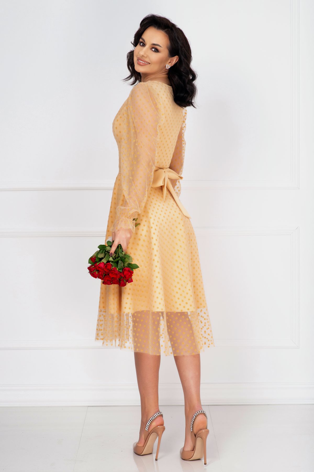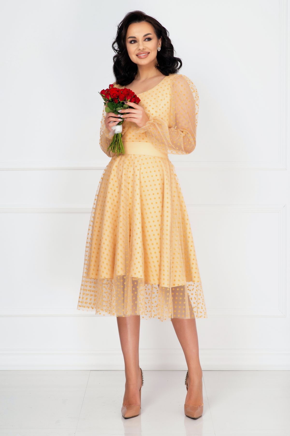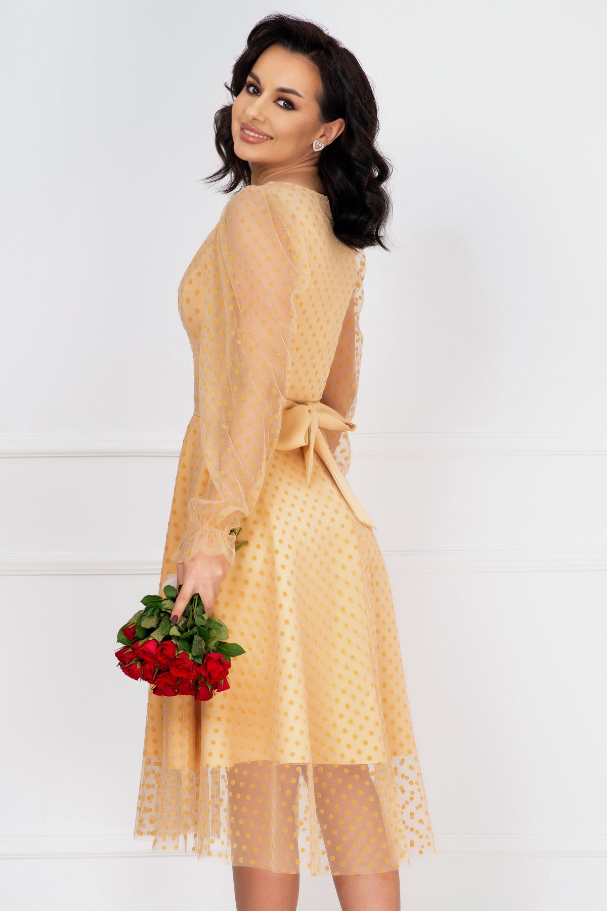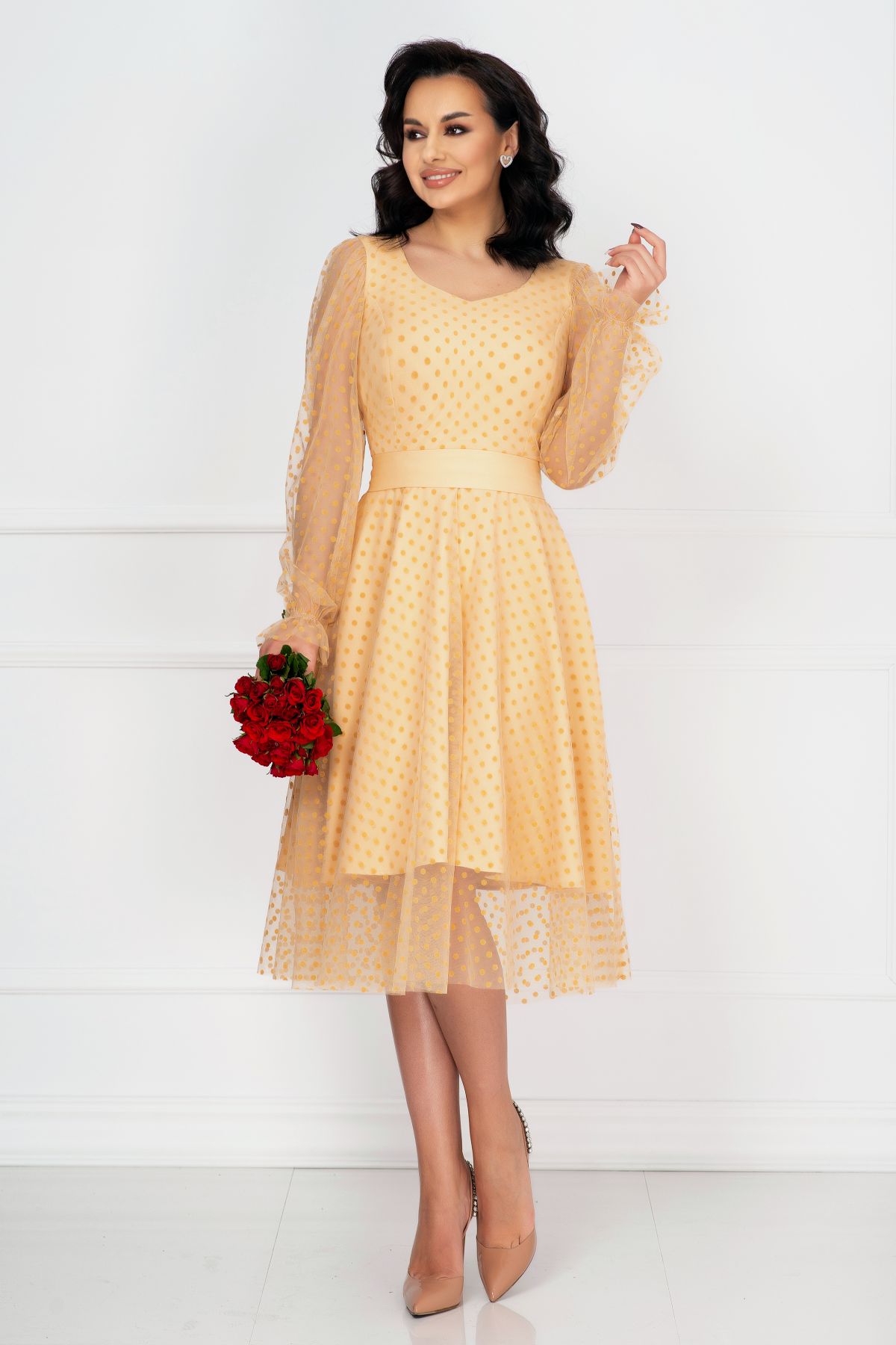 Rochie de ocazie InPuff crem acoperita de tulle cu buline ; Culoare: crem ; Croi: clos ; Material vaporos delicat la atingere ; Decolteu in V ; Inchidere cu fermoar la spate ; Maneci lungi din tul cu buline ; Fusta ampla incretita din talie ; Terminatie maneci cu elastic si volanas ; Prezinta dublura ; Tulle decorat cu buline catifelate ; Cusatura in talie ; Compozitie: 100% poliester ; Fabricat in Romania ; Exclusivitate InPuff ; * Echipa noastra face toate eforturile in a prezenta cat mai bine culorile produselor prezentate pe site insa culorile pot diferi de situatia reala si pot varia în functie de setarile monitorului/dispozitivului dvs!