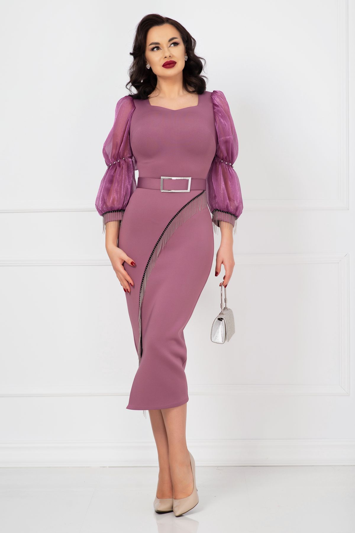 Rochie de ocazie lila cu franjuri argintii si maneci din organza ; Culoare: lila ; Croi: cambrat ; Decolteu in V ; Maneci bufante din organza cu elastic si bilute argintii ; Manseta elastica cu banda neagra si franjuri argintii ; Material usor elastic ; Inchidere cu fermoar la spate ; Crapatura laterala ; Decorata cu banda neagra cu franjuri argintii ; Curea detasabila in talie ; Catarama argintie cu strassuri ; Compozitie: 63% poliester 32% bumbac 5% lycra ; * Echipa noastra face toate eforturile in a prezenta cat mai bine culorile produselor prezentate pe site insa culorile pot diferi de situatia reala si pot varia în functie de setarile monitorului/dispozitivului dvs!