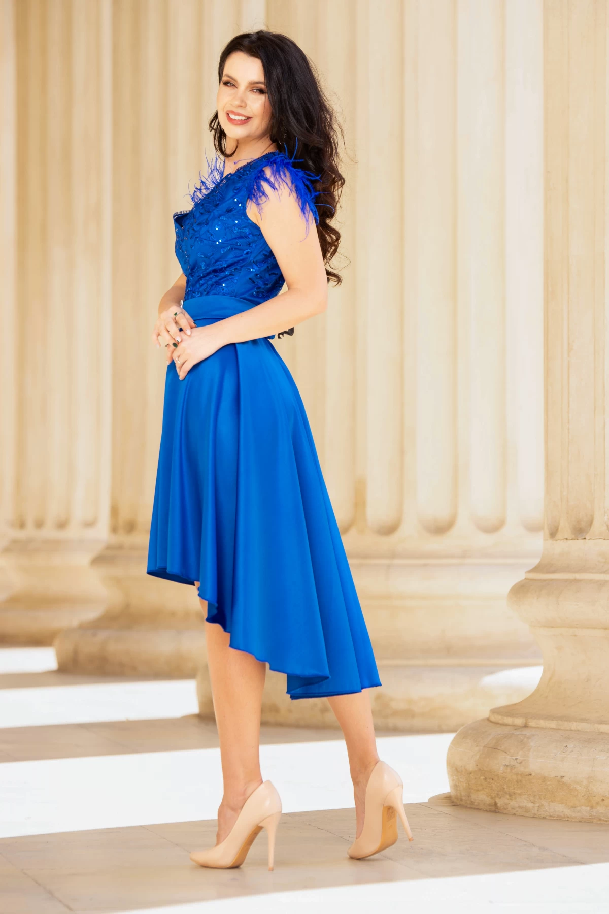 Rochie de ocazie midi albastru royal cu fulgi la umeri ; Culoare: albastru royal ; Croi: clos ; Textura: tafta subtire tulle brodat paiete ; Fara maneci ; Fulgi decorativi in zona umerilor ; Decolteu in V ; Buzunare laterale functionale ; Tulle brodat cu model floral si paiete discrete in partea de sus ; Lungime asimetrica ; Inchidere cu fermoar la spate ; Cordon detasabil cu catarama argintie cu strassuri ; Compozitie: 95% poliester 5% elastan ; Prezinta 53 cm lungime din cusatura taliei pana jos in partea din fata si 81 cm lungime partea din spate ; Fabricat in Romania ; * Echipa noastra face toate eforturile in a prezenta cat mai bine culorile produselor prezentate pe site insa culorile pot diferi de situatia reala si pot varia în functie de setarile monitorului/dispozitivului dvs!